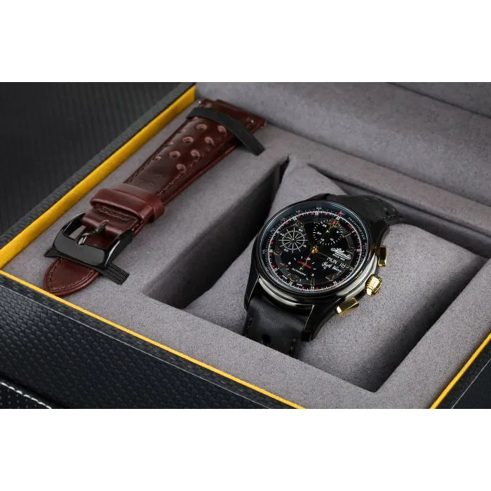 Zegarek oferuje pełny chronograf mechaniczny oparty na Valjoux 7750 - z centralnym sekundnikiem stopera oraz licznikami minut i godzin, pozwalającymi precyzyjnie mierzyć czas przejazdu odcinków. Na co dzień jest praktycznym narzędziem dzięki podwójnemu datownikowi (dzień tygodnia + dzień miesiąca) oraz skali tachymetrycznej, która umożliwia obliczanie średniej prędkości na zadanym dystansie, dokładnie jak w kokpicie rajdowego auta.