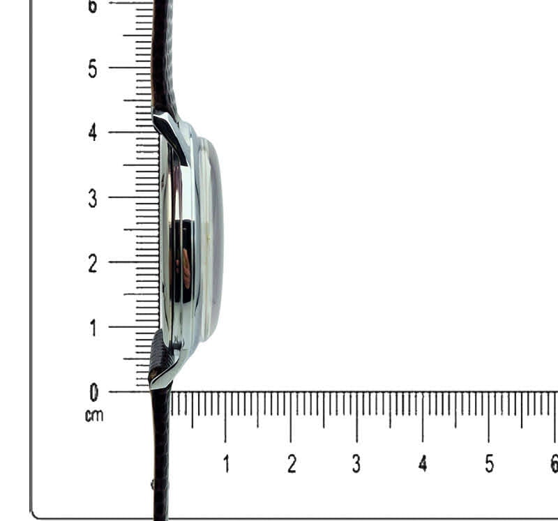 - Materiał koperty: mosiądz chromowany, typowy dla szwajcarskich zegarków z lat 50.-60., zapewniający lekkość konstrukcji i elegancki wygląd.