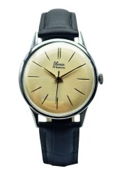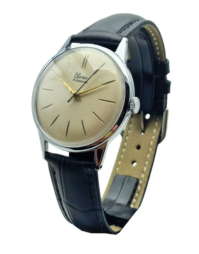 Prezentowany zegarek Błonie „16 kamieni” to jeden z najbardziej rozpoznawalnych modeli produkowanych przez Zakłady Mechaniki Precyzyjnej w Błoniu - symbol początków polskiego zegarmistrzostwa naręcznego. Egzemplarz pochodzi z pierwszej połowy lat 60. XX wieku (ok. 1962-1964) i reprezentuje klasyczną stylistykę użytkową tamtego okresu, łącząc prostotę formy z solidną mechaniką. To zegarek zaprojektowany jako elegancki, codzienny czasomierz, przeznaczony do noszenia zarówno z garniturem, jak i w mniej formalnych sytuacjach.