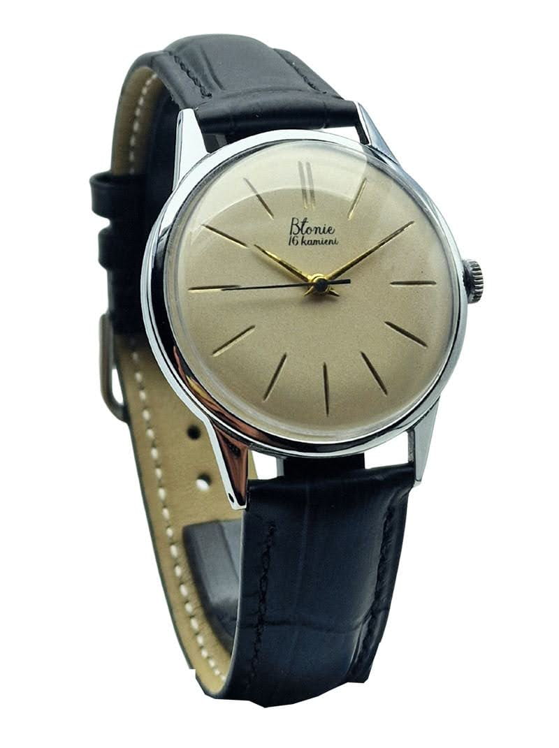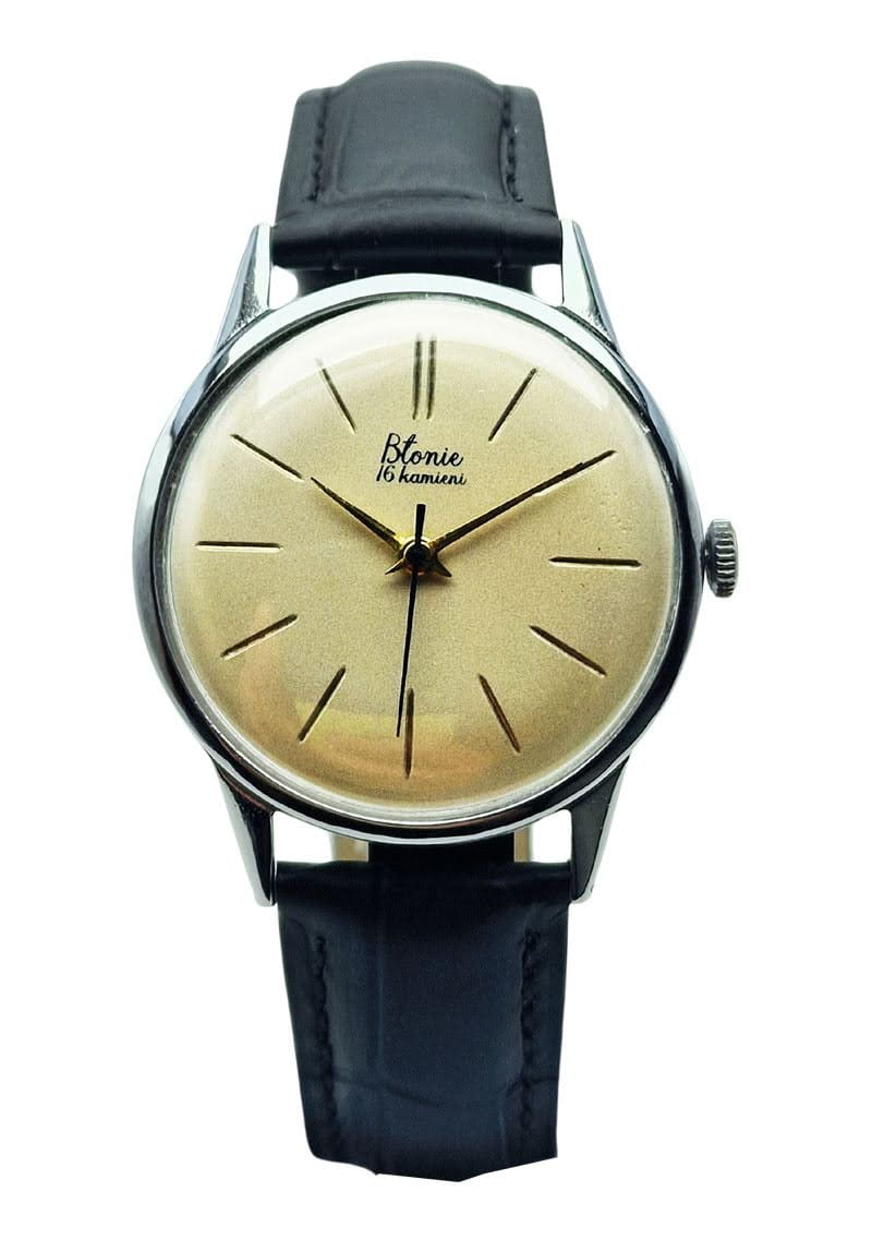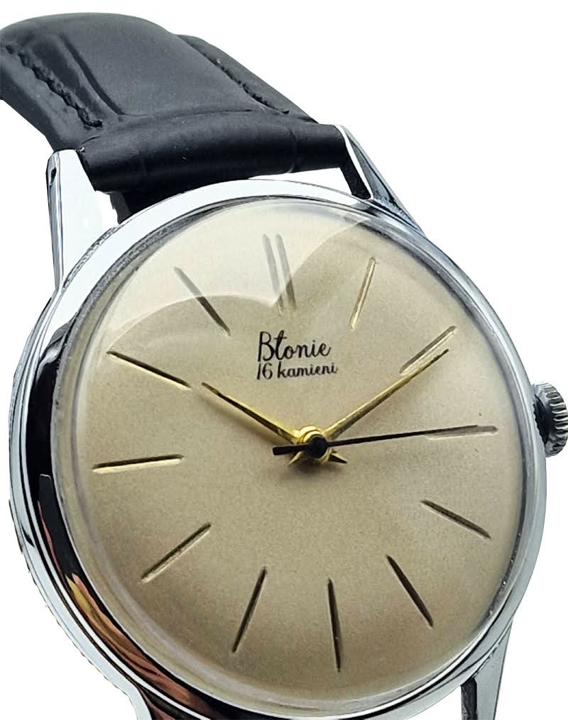 Tarcza utrzymana jest w ciepłym, szampańskim odcieniu, charakterystycznym dla zegarków Błonie z początku lat 60. Zastosowano smukłe, złocone indeksy liniowe z podwójnym indeksem na godzinie 12, które nadają całości elegancki i symetryczny wygląd. Oryginalny nadruk „Błonie - 16 kamieni” oraz centralna sekunda podkreślają autentyczność tarczy i jej klasyczny, użytkowy charakter.
