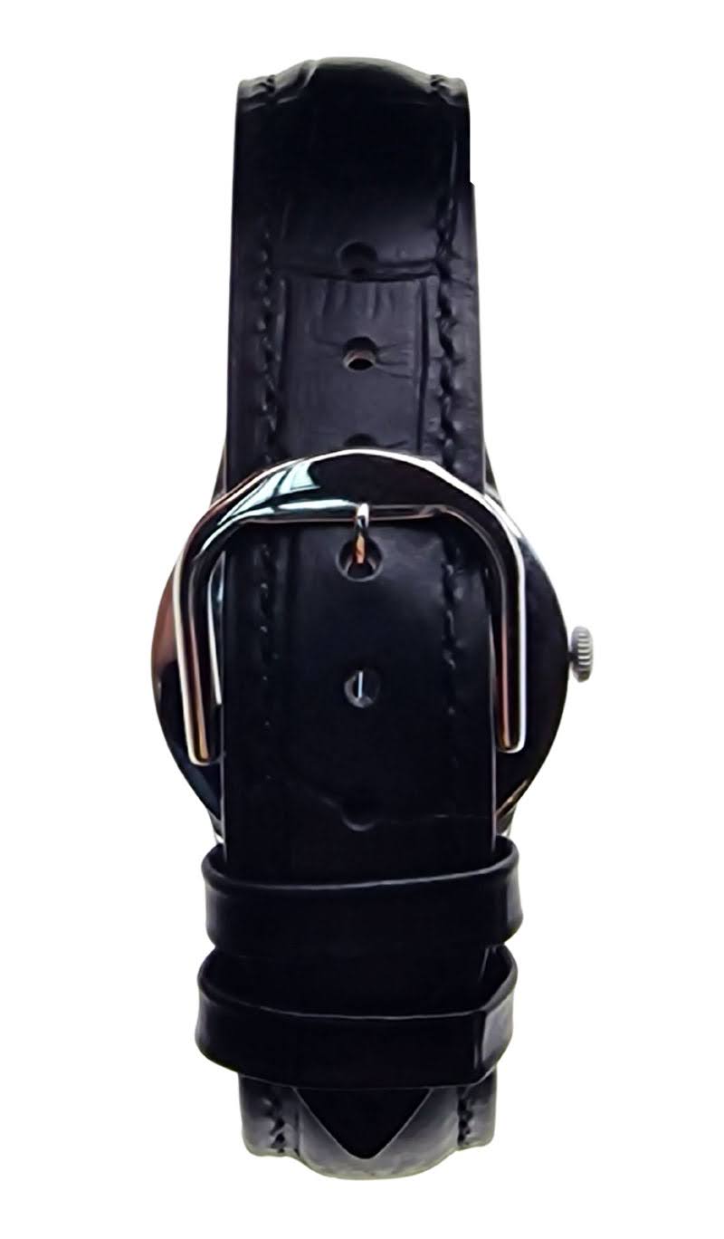 Zegarek osadzony jest na pasku z naturalnej skóry w kolorze czarnym, z eleganckim tłoczeniem i dekoracyjnym przeszyciem. Pasek ma szerokość 18 mm i zapewnia komfort noszenia przy maksymalnym obwodzie nadgarstka do 21 cm. Całość uzupełnia klamerka ze stali nierdzewnej, która stylistycznie dobrze komponuje się z klasycznym charakterem zegarka.