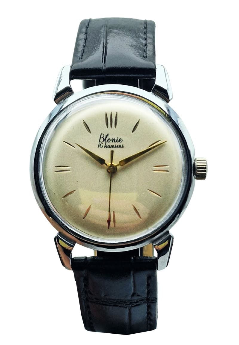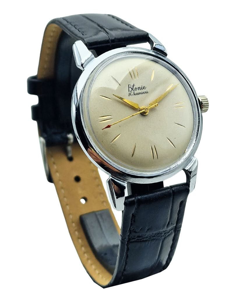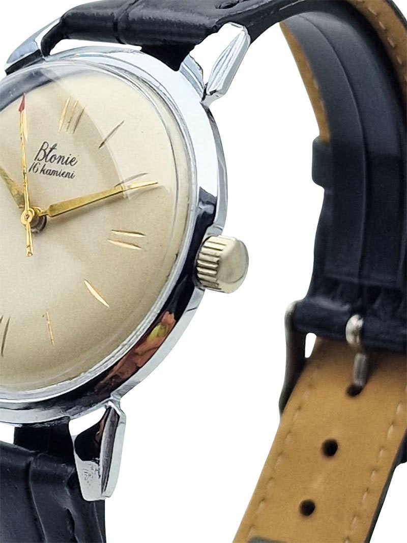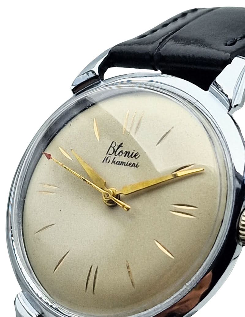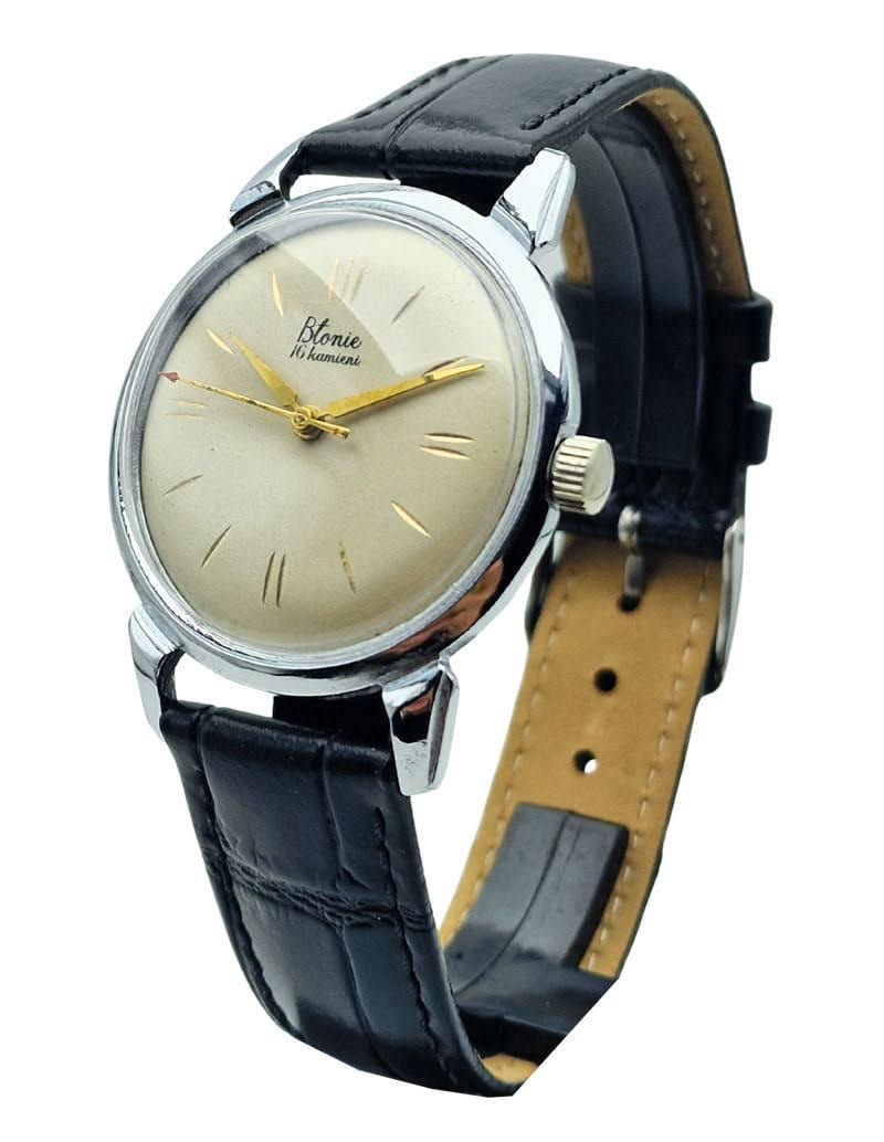 Model Błonie „16 kamieni” to jedno z najbardziej rozpoznawalnych osiągnięć polskiego zegarmistrzostwa, łączące prostotę, funkcjonalność i ponadczasowy styl. Zegarek zachwyca subtelną estetyką charakterystyczną dla przełomu lat 50. i 60., reprezentując okres dynamicznego rozwoju krajowej produkcji czasomierzy. Smukła koperta, klasyczna tarcza i delikatne złocone elementy tworzą kompozycję, która dzisiaj jest prawdziwą ikoną kolekcjonerską.