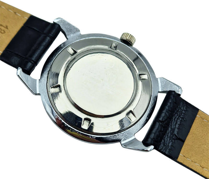 - Materiał: koperta wykonana z chromowanego mosiądzu, co było standardem w polskich zegarkach z lat 60. i zapewnia charakterystyczny połysk oraz lekką konstrukcję.