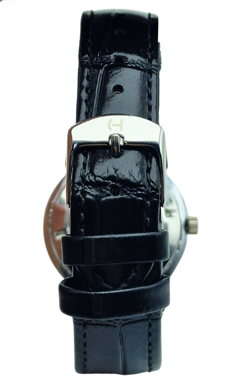 Pasek wykonano z czarnej, lakierowanej skóry naturalnej z delikatnym tłoczeniem, które dodaje mu eleganckiego i klasycznego charakteru. Jego szerokość 18 mm sprawia, że idealnie proporcjonalnie uzupełnia smukłą kopertę zegarka, a maksymalny obwód 20,5 cm zapewnia wygodne dopasowanie do nadgarstka. Całość zamyka solidna klamerka ze stali nierdzewnej, która gwarantuje trwałość i estetyczne wykończenie.