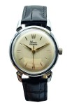 Zegarek pochodzi z Zakładów Mechaniczno-Precyzyjnych Błonie, jedynej fabryki w Polsce, która w latach 1959-1969 produkowała krajowe mechaniczne czasomierze. Powstawał w okresie, gdy polskie wzornictwo czerpało inspiracje z radzieckich technologii, ale jednocześnie rozwijało własny, charakterystyczny styl. Ten egzemplarz reprezentuje najbardziej rozpoznawalną linię modeli z połowy lat 60., które dziś stanowią ważny element historii polskiego zegarmistrzostwa.