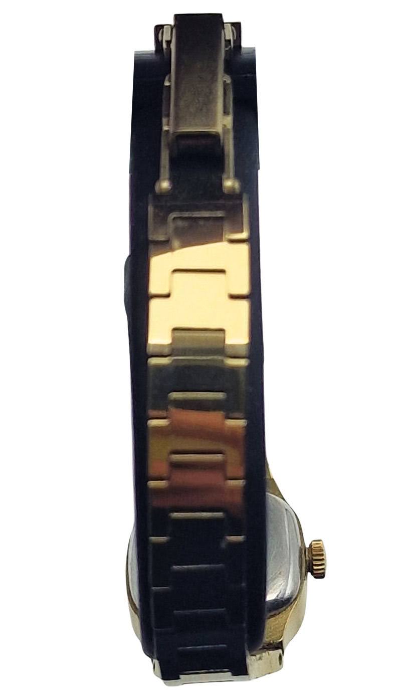 Elegancki zegarek dla kobiety, który łączy biżuteryjną formę z klasycznym, mechanicznym sercem. Smukła, prostokątno-zaokrąglona koperta, jasna tarcza z arabskimi cyframi oraz delikatna złocona bransoleta tworzą spójną, subtelną całość w duchu estetyki lat 60.-70. To autentyczny przykład radzieckiego wzornictwa, zaprojektowany jako codzienna, elegancka ozdoba nadgarstka.