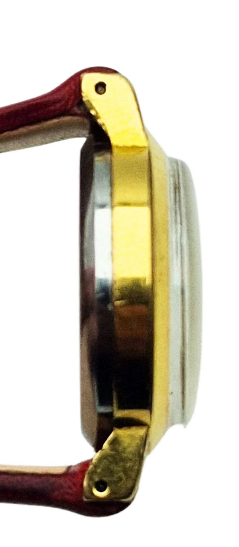 Grubo złocona koperta o średnicy 23 mm zachowuje oryginalne krawędzie i nie była poddawana polerowaniu maszynowemu. Nosi normalne ślady użytkowania, które dodają jej szlachetnej patyny. Złocenie w połączeniu ze stalowym deklem tworzy trwałą i estetyczną całość.