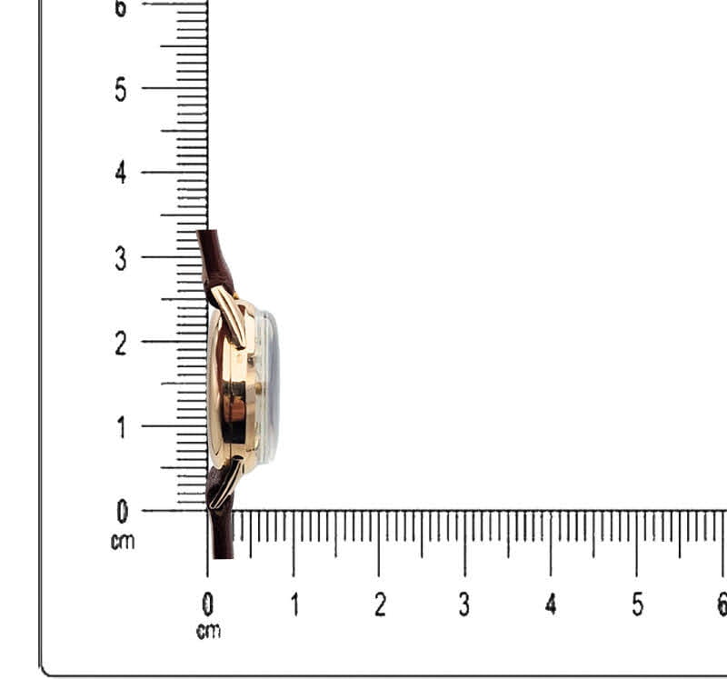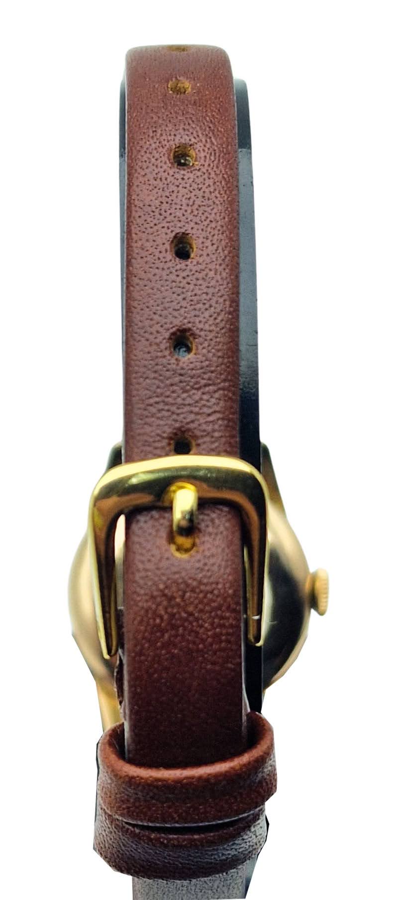 Zegarek wyposażony jest w pasek z naturalnej skóry w kolorze brązowym, wykończony delikatnym przeszyciem w tonacji beżowej. Jego klasyczna forma idealnie współgra z eleganckim charakterem koperty, zapewniając jednocześnie wysoki komfort noszenia. Pasek ma szerokość 12 mm i maksymalny obwód 18 cm, dzięki czemu doskonale dopasowuje się do smuklejszego nadgarstka.