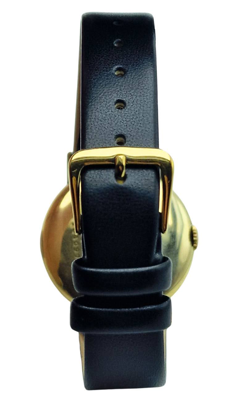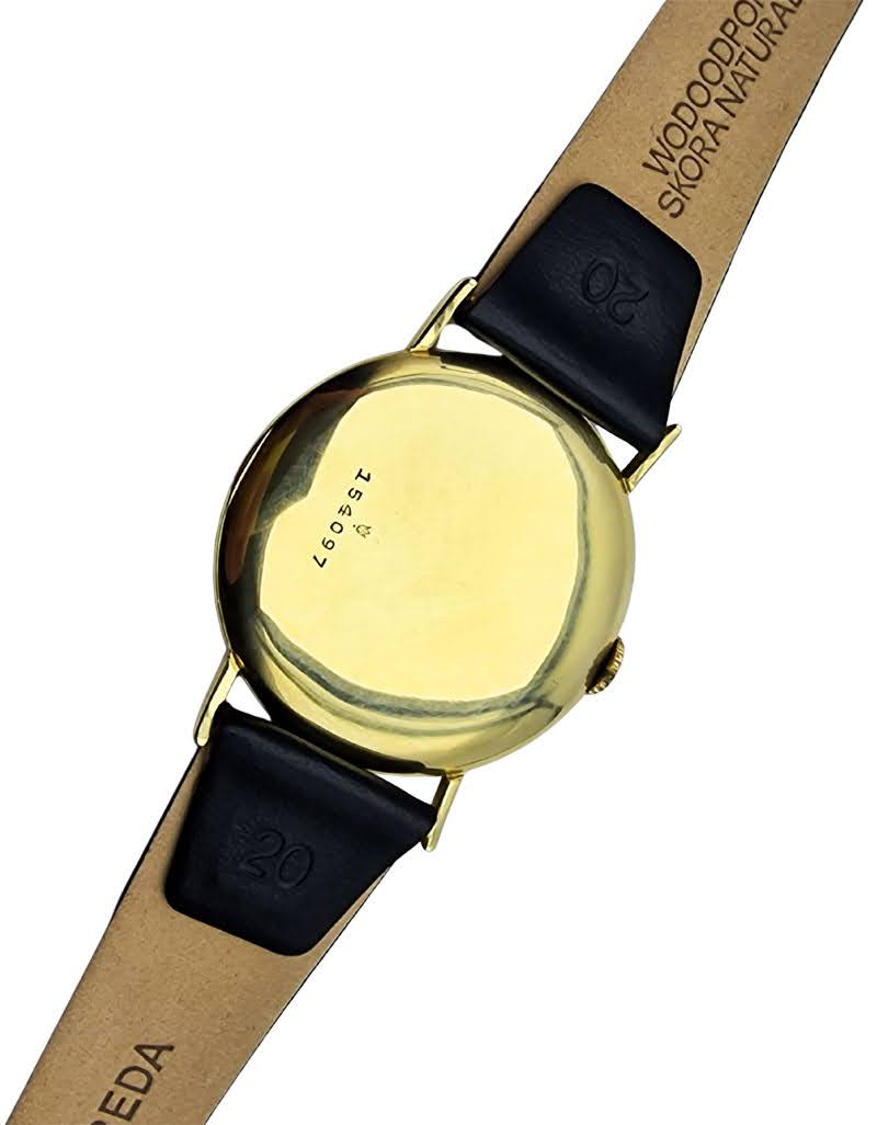 Koperta wykonana jest z litego złota 14K (585), zachowana w doskonałych proporcjach i o eleganckim, ciepłym połysku. Dekiel zaciskany nosi numer seryjny 10 202 oraz logo producenta, potwierdzające autentyczność egzemplarza. Całość dopełnia drobno karbowana koronka oraz smukłe, profilowane uszy, które nadają zegarkowi lekkości i ponadczasowego wdzięku.