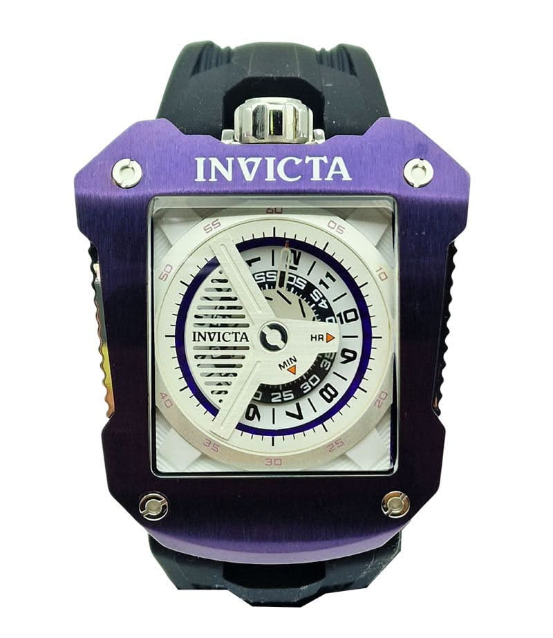 Wyróżnia się biało-fioletowym wykończeniem o wielowarstwowej budowie, które nadaje jej głębi i nowoczesnego charakteru. Zamiast klasycznych wskazówek zastosowano obrotowe dyski godzin i minut, oznaczone czytelnymi wskaźnikami „HR” i „MIN”. Całość uzupełnia zewnętrzny pierścień minutowy z wyraźnymi oznaczeniami oraz dekoracyjna kratkowana powierzchnia z logo Invicta, podkreślająca fg,.