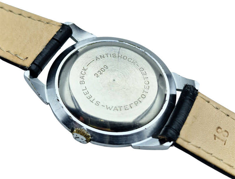 Koperta zegarka została wykonana z mosiądzu pokrytego chromem, co nadaje jej połysk i podkreśla klasyczny styl. Od spodu zamyka ją stalowy, wciskany dekiel z oznaczeniami „Antishock”, „Waterprotected” oraz numerem kalibru 2209. Całość uzupełnia karbowana koronka w kolorze srebrnym, która zapewnia wygodę obsługi i spójność z detalami koperty.