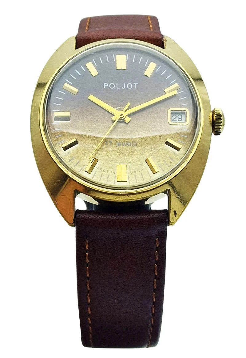 Prezentowany mechaniczny zegarek Poljot to kwintesencja stylistyki lat 70., łącząca radziecką solidność z odważnym designem tamtej epoki. Model ten, zachowany w oryginalnym, nienaruszonym stanie, stanowi rzadki przykład wzornictwa typu "tonneau" (beczka), który doskonale wpisuje się w dzisiejszą modę na retro-elegancję. Dzięki gradientowej tarczy i masywnej, pozłacanej obudowie, czasomierz ten przyciąga wzrok i stanowi doskonałą alternatywę dla masowej produkcji.