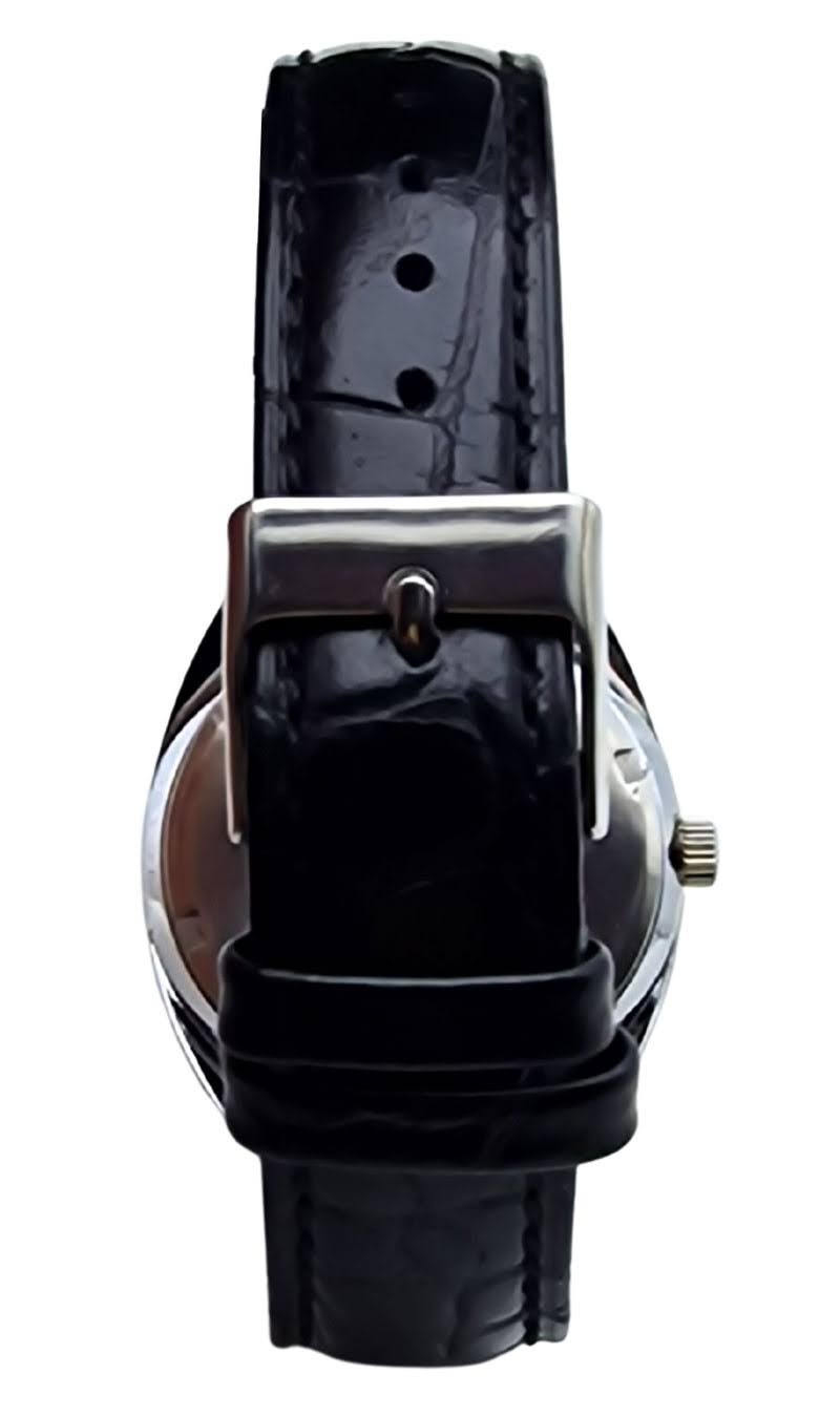 Czarny pasek wykonany z wysokogatunkowej skóry cielęcej, o klasycznym charakterze i eleganckim wyglądzie. Szerokość przy uszach koperty wynosi 18 mm. Całość uzupełnia klasyczne zapięcie w kolorze srebrnym, dobrze korespondujące z detalami zegarka. Maksymalny obwód nadgarstka (zegarek + pasek): 21 cm.