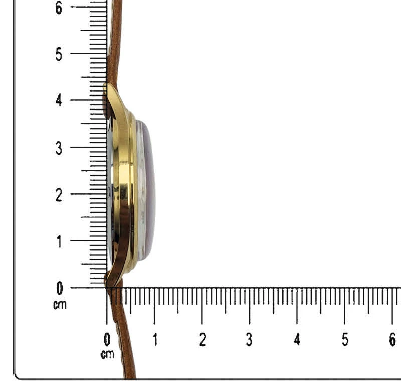 Zegarek oferowany jest na nowym, skórzanym pasku o szerokości 19 mm w odcieniu klasycznego brązu. Gładka faktura skóry podkreśla prestiżowy charakter złotej koperty, tworząc zestaw gotowy do założenia natychmiast po rozpakowaniu.