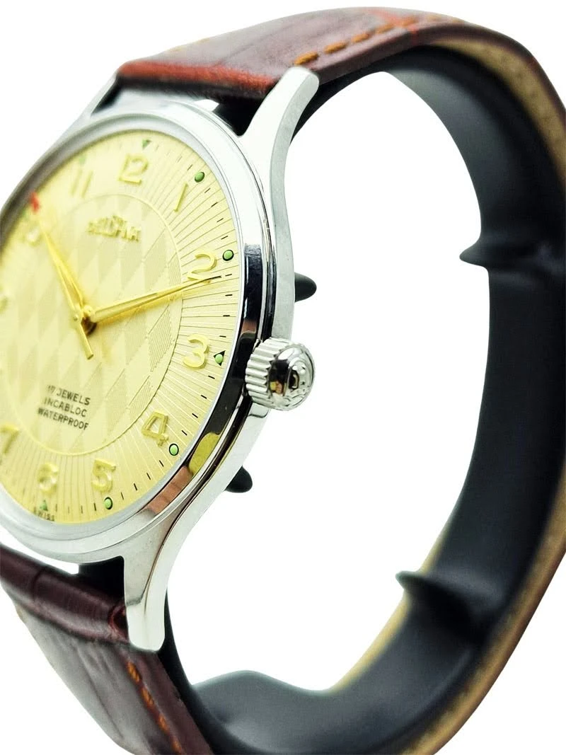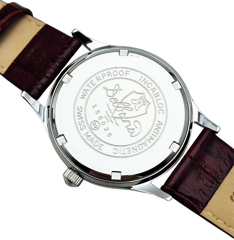 - Oznaczenia: „17 Jewels”, „Incabloc”, „Waterproof”, „Swiss”, podkreślające techniczne zaplecze zegarka.