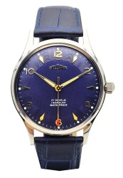 Tarcza zegarka utrzymana jest w głębokim, granatowym kolorze z subtelnym, promienistym giloszowaniem, które nadaje jej elegancji i głębi wizualnej. Złocone cyfry arabskie i indeksy w połączeniu z punktami luminescencyjnymi zapewniają bardzo dobrą czytelność oraz ciekawy kontrast kolorystyczny.