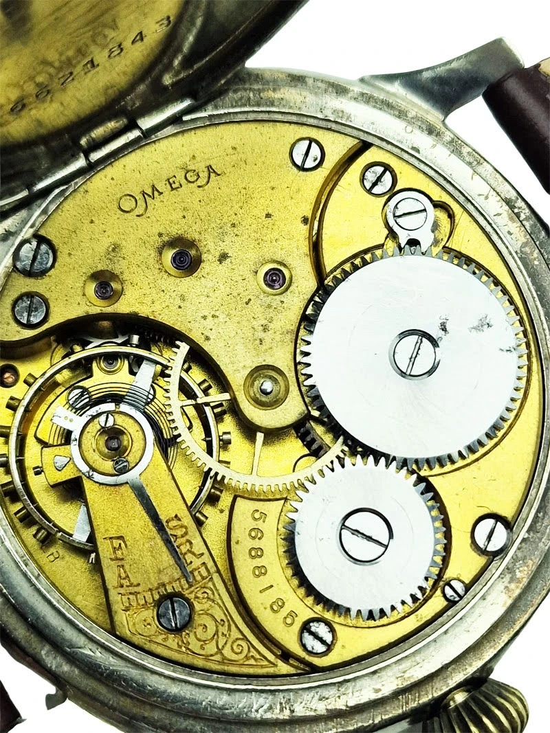 Serce zegarka zostało wyprodukowane w szwajcarskich zakładach Omega w latach 20. XX wieku. Numer seryjny mechanizmu 5688185 precyzyjnie osadza jego powstanie w epoce, gdy marka ta dominowała w dziedzinie precyzyjnych chronometrów, a standardy wykończenia detali stały na najwyższym światowym poziomie.