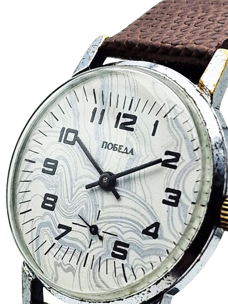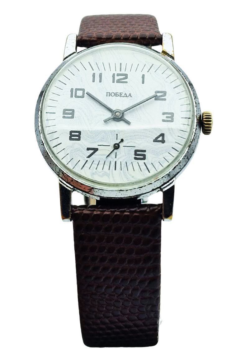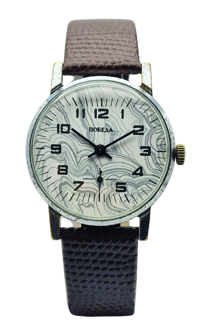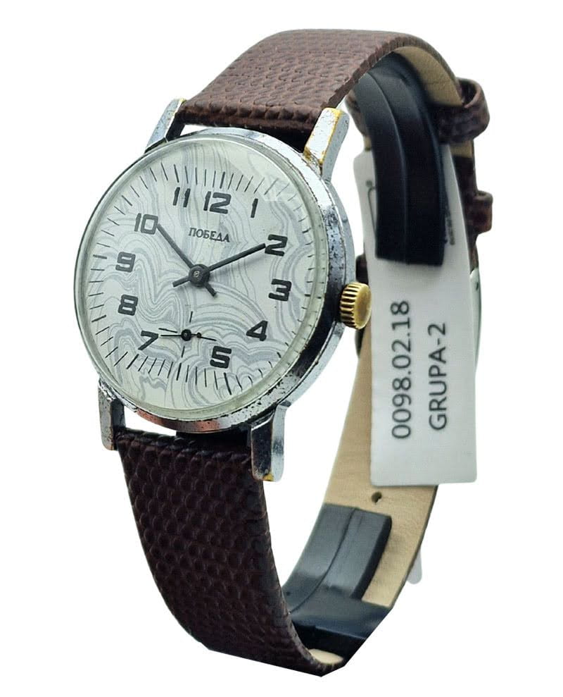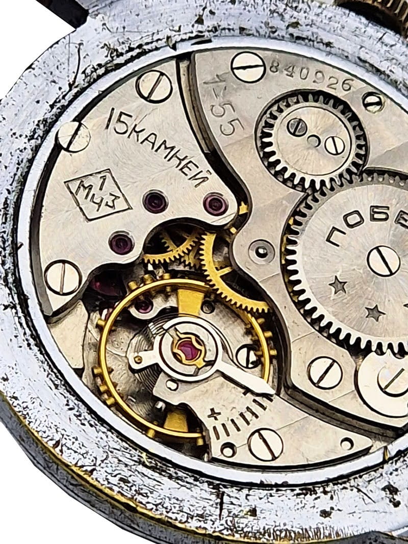 Zegarek wykonany w Związku Radzieckim w I kwartale 1955 roku, co jest precyzyjnie udokumentowane sygnaturą 1-55 na mechanizmie. Powstał w okresie, gdy radziecka produkcja zegarków opierała się na sprawdzonych, wysokiej jakości konstrukcjach (system Kirowa). Oznaczenie mechanizmu oraz unikatowy wzór tarczy potwierdzają oryginalność wszystkich podzespołów i przynależność do złotej ery marki Pobieda.