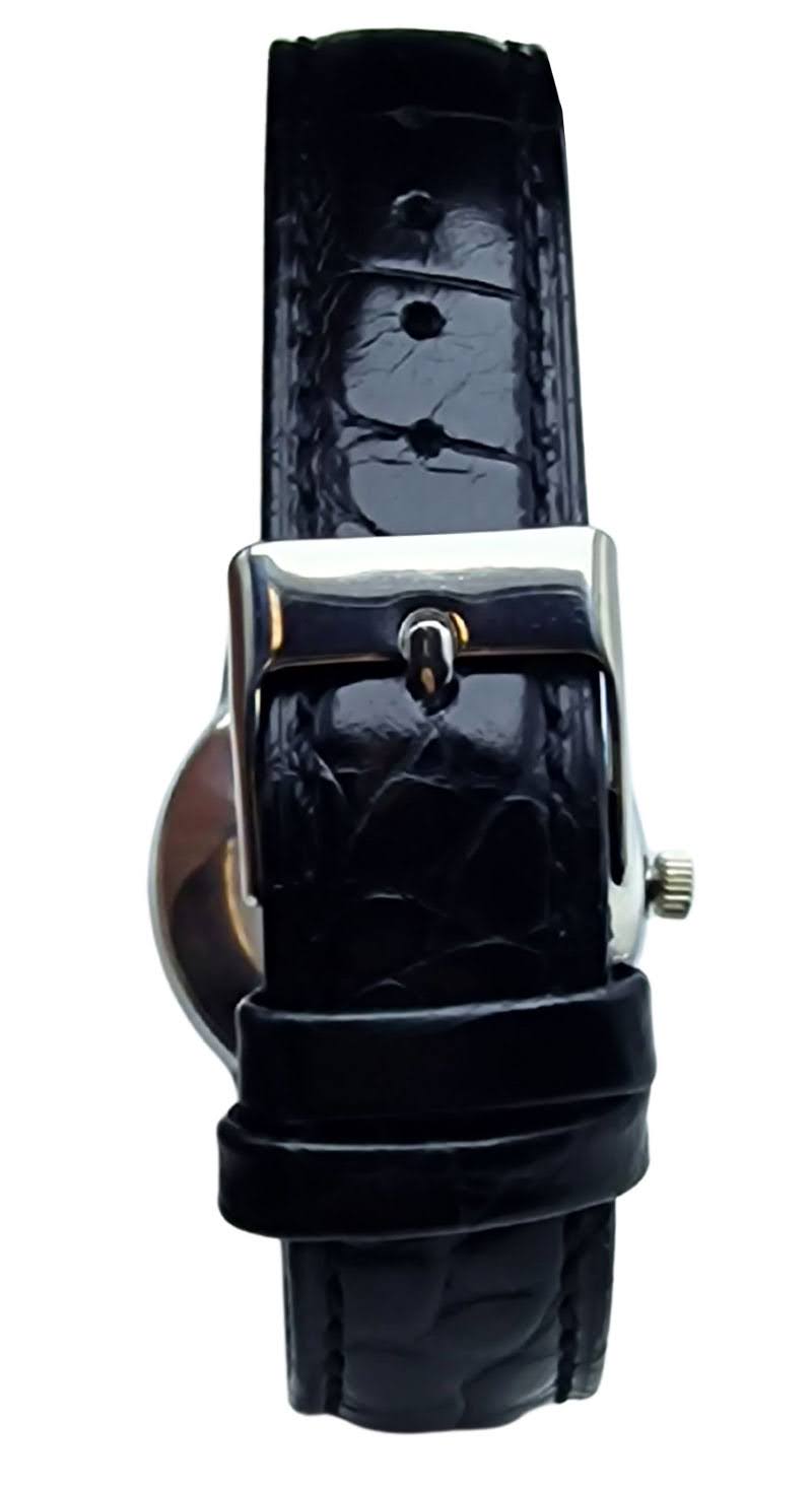 Pasek wykonano z wysokogatunkowej skóry naturalnej w kolorze czarnym, ozdobionej subtelnym tłoczeniem, które nadaje mu elegancki, klasyczny wygląd. Jego szerokość wynosi 18 mm, co idealnie współgra z proporcjami koperty. Maksymalny obwód 20,5 cm zapewnia wygodne dopasowanie do większości nadgarstków, a tradycyjna klamerka ze stali gwarantuje pewne i trwałe zapięcie.