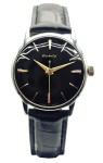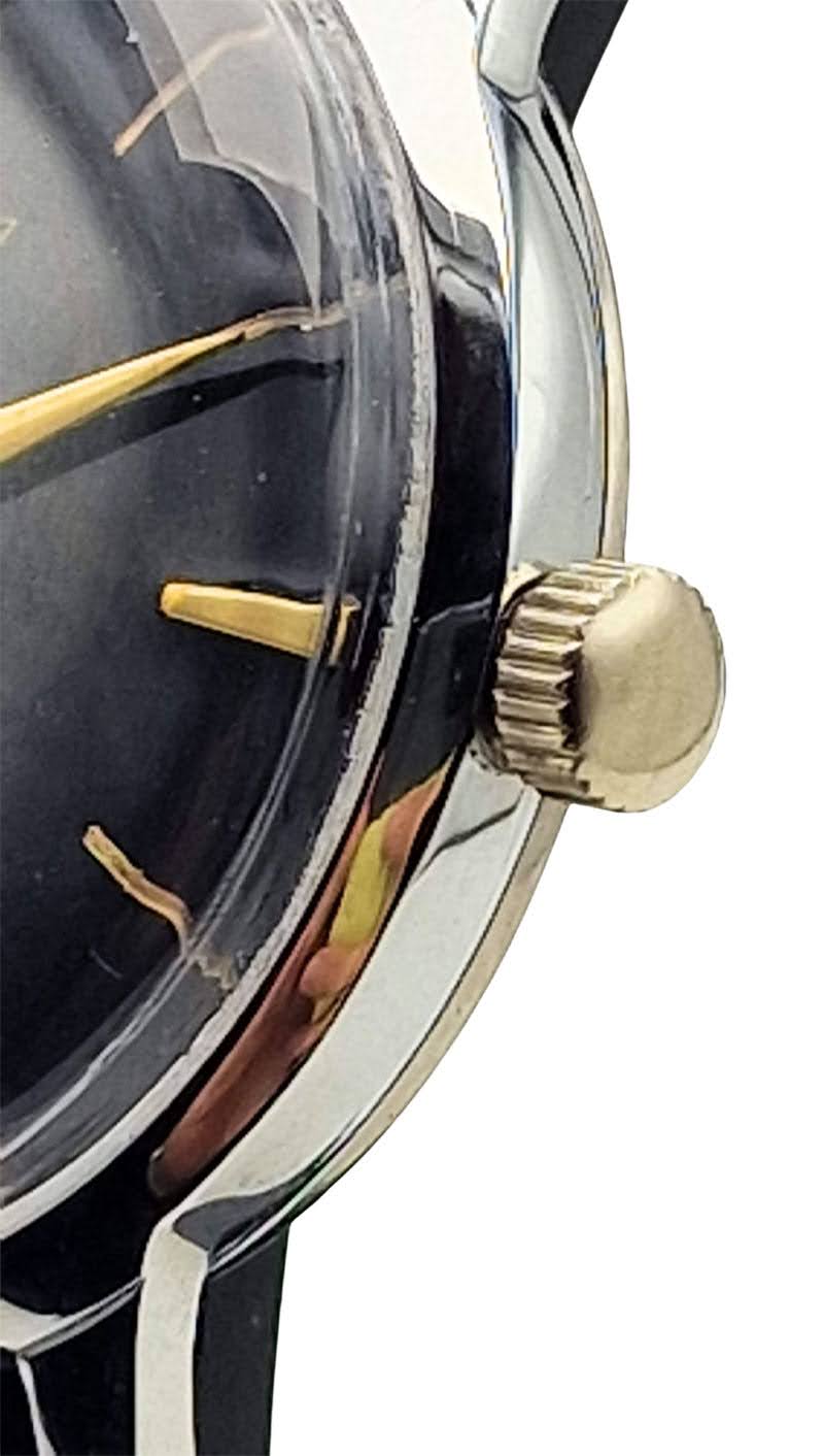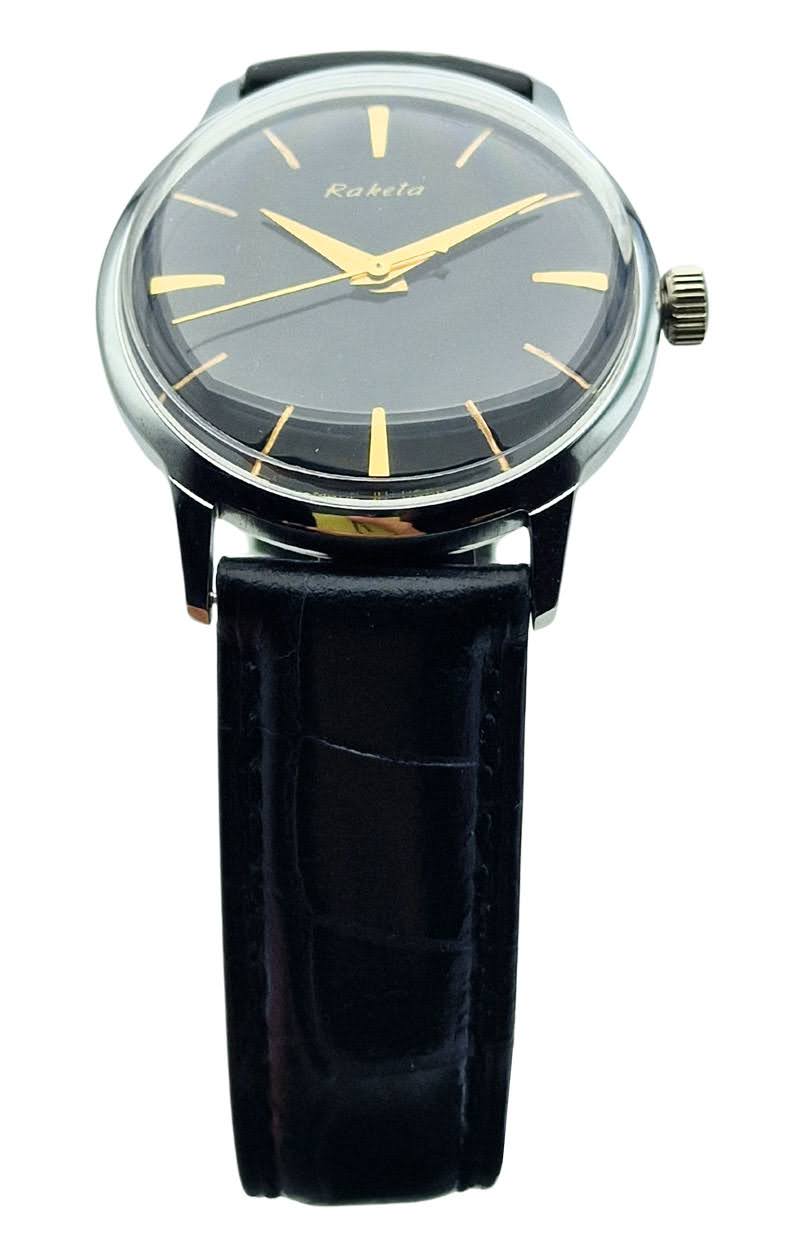 Tarcza zegarka utrzymana jest w głębokim czarnym kolorze, który pięknie kontrastuje ze złoconymi indeksami godzinowymi i smukłymi wskazówkami. Jej minimalistyczny układ bez datownika nadaje całości harmonii i przejrzystości, podkreślając klasyczny charakter modelu Raketa. Subtelne logo producenta umieszczone poniżej godziny 12 dodaje tarczy autentyczności i elegancji właściwej radzieckim zegarkom z epoki.