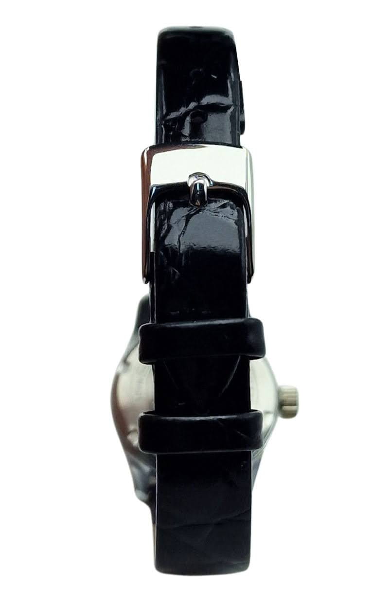 Pasek ma szerokość 12 mm, dzięki czemu zachowuje proporcje niewielkiej koperty i wygodnie układa się na nadgarstku. Maksymalny obwód zegarka wynosi około 18 cm, co dobrze odpowiada smukłej konstrukcji modelu. Całość zakończona jest klamerką ze stali nierdzewnej, zapewniającą pewne i trwałe zapięcie.