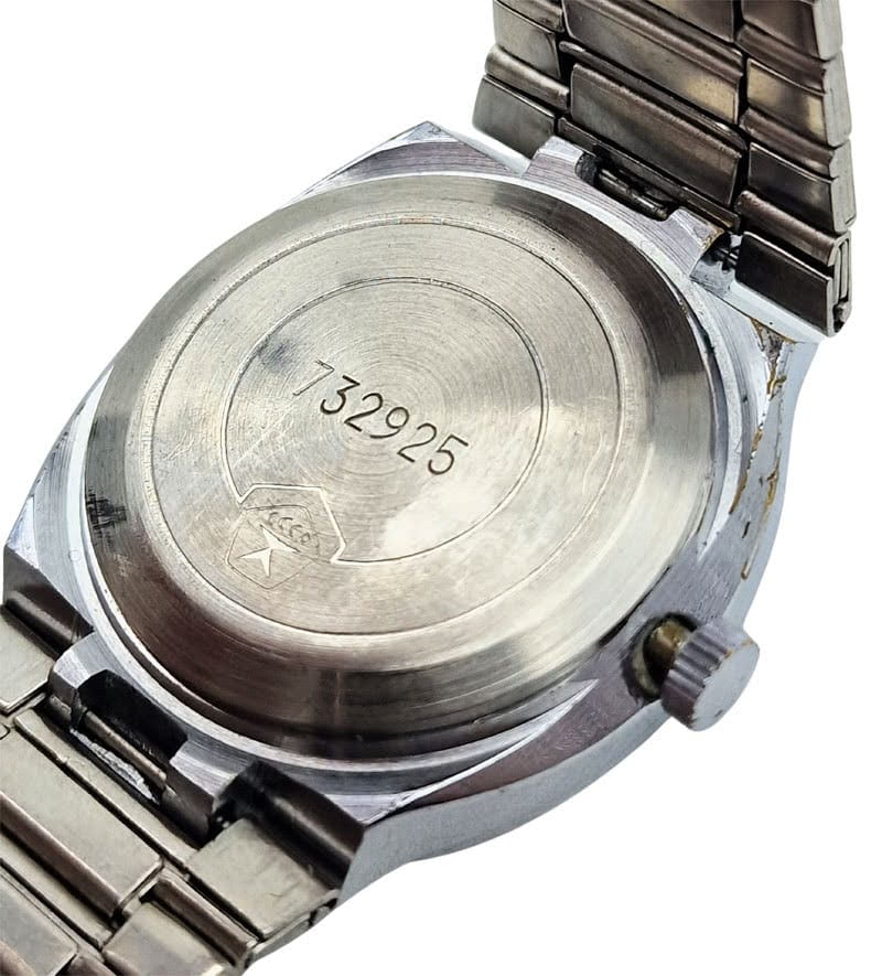 - Materiał: mosiądz pokryty warstwą chromu - klasyczne rozwiązanie w radzieckich zegarkach tej epok.