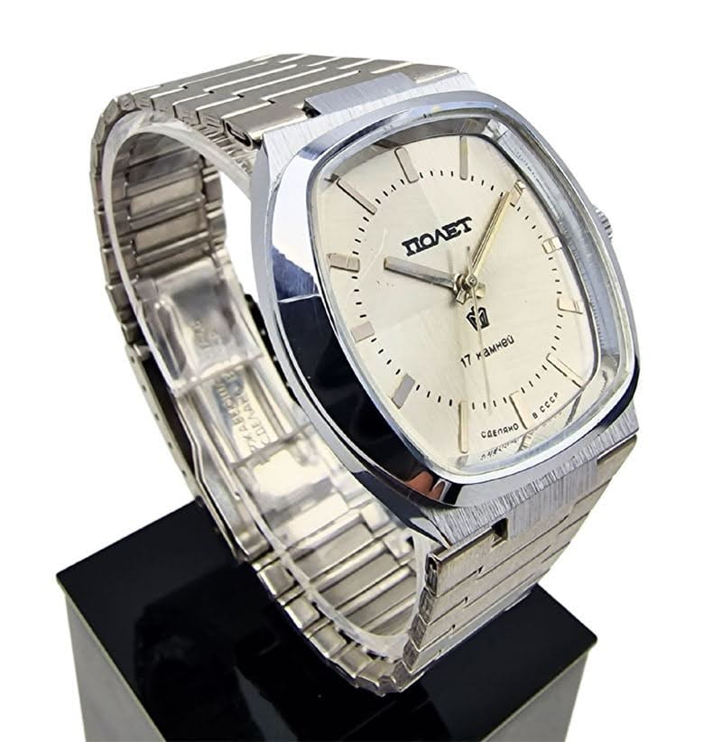 Tarcza zegarka ma elegancki, jasnosrebrny kolor z wyraźnym pionowym szczotkowaniem, które nadaje jej technicznego charakteru. Złocone, prostokątne indeksy godzinowe kontrastują z czarną podziałką minutową, umieszczoną wewnątrz – bliżej środka tarczy, tworząc czytelny i spójny układ. Całość dopełniają radzieckie sygnatury: logo Полет, oznaczenie „17 камней” oraz napis „Сделано в СССР”, podkreślające pochodzenie i ducha epoki.