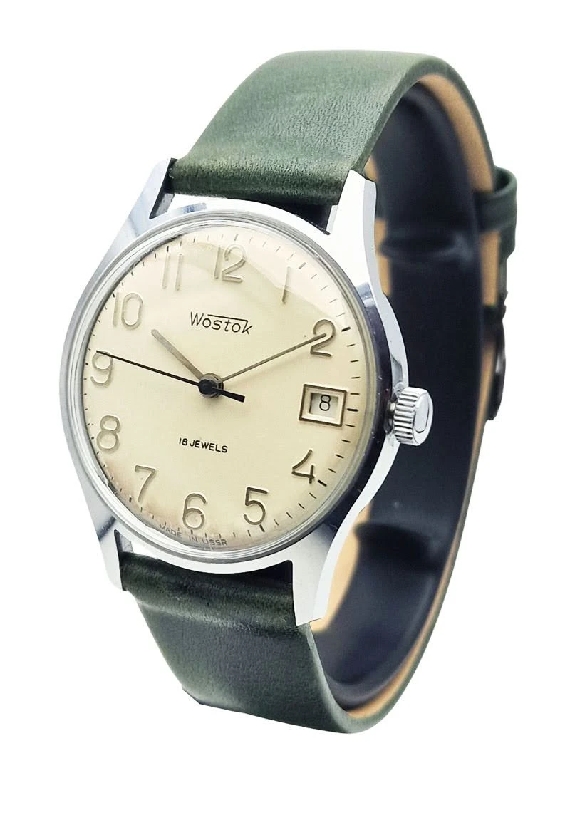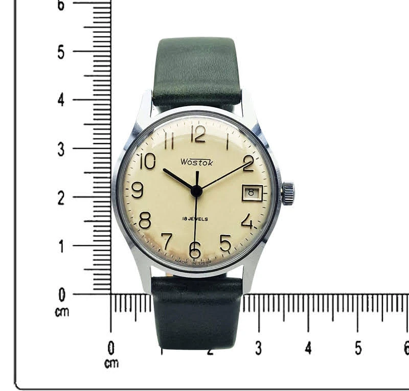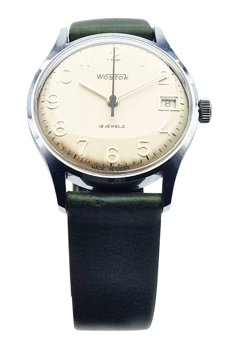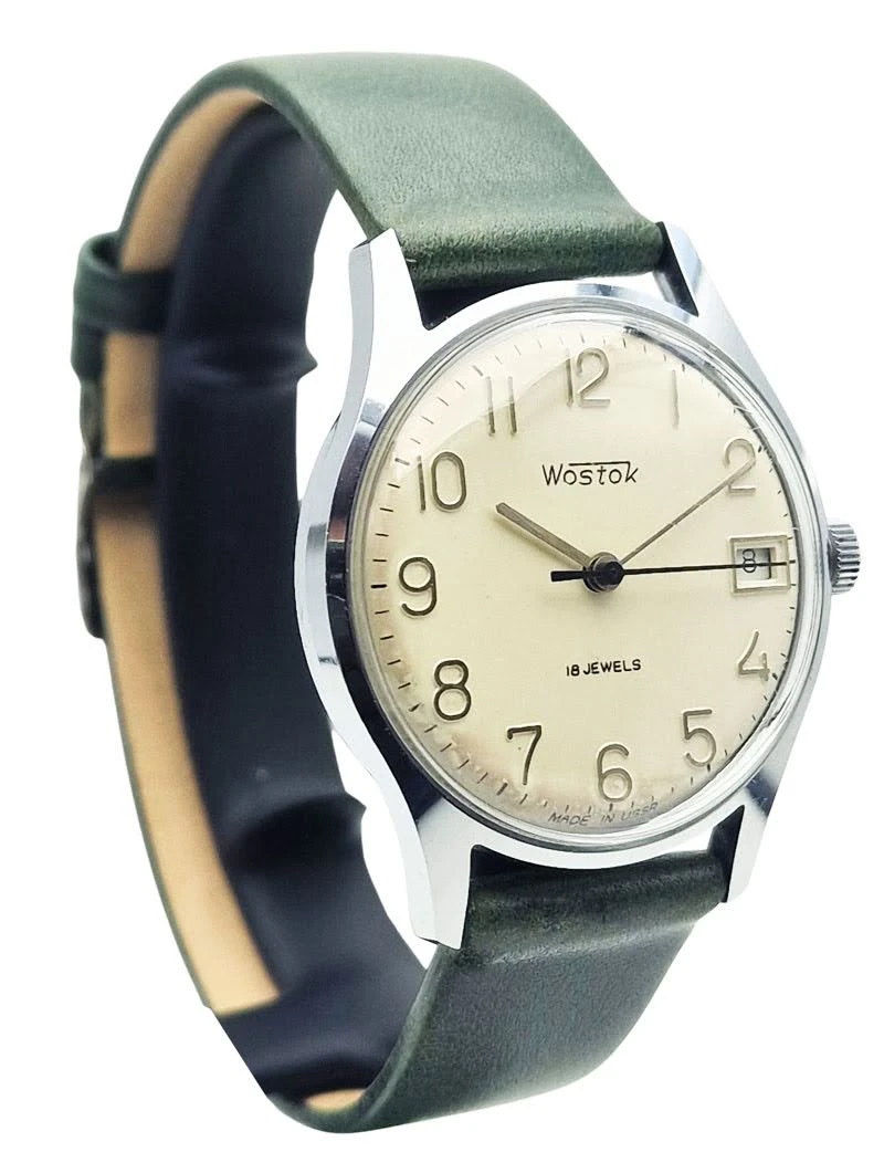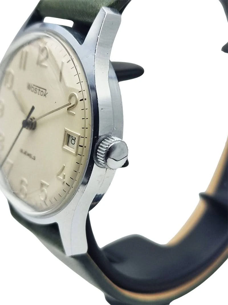 Tarcza zegarka ma srebrny kolor i bardzo czysty, uporządkowany układ, który dobrze podkreśla klasyczny charakter tego modelu. Zastosowano na niej pełne cyfry arabskie, napis Wostok, oznaczenie 18 JEWELS oraz datownik umieszczony na godz. 3, dzięki czemu całość pozostaje czytelna i funkcjonalna. Kompozycję dopełnia napis Made in USSR, który wzmacnia autentyczny, radziecki charakter zegarka.