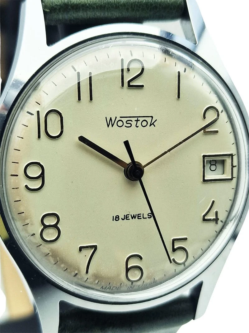 - Napisy: pod godz. 12 umieszczono napis Wostok, a poniżej oznaczenie 18 JEWELS, które odnosi się do liczby kamieni łożyskujących mechanizmu. Przy dolnej krawędzi tarczy widnieje również napis Made in USSR, podkreślający radzieckie pochodzenie zegarka.
