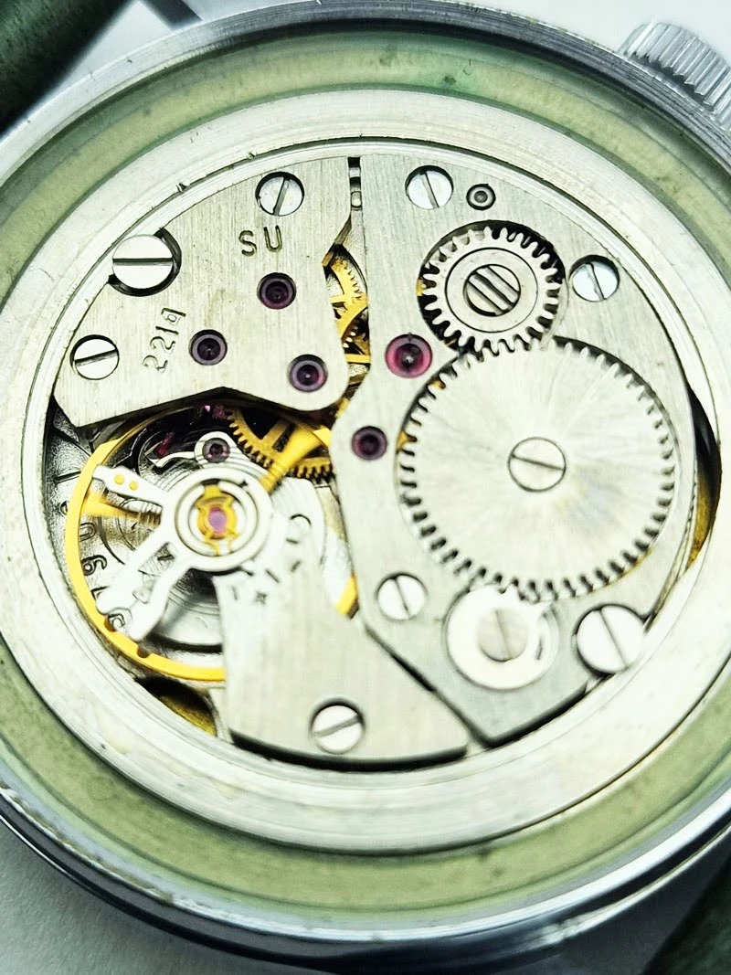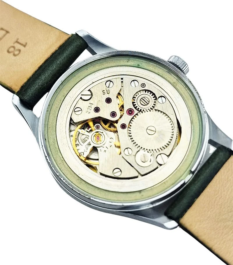 Mechanizm Wostok 2214 o numerze seryjnym 190645 to klasyczna radziecka konstrukcja z ręcznym naciągiem, ceniona za prostotę, trwałość i użytkowy charakter. Kaliber ten posiada 18 kamieni łożyskujących, co stanowi typowy układ dla tej rodziny mechanizmów i sprzyja stabilnej pracy układu chodu. Po pełnym nakręceniu sprężyny oferuje około 38 godzin rezerwy chodu, a w tym egzemplarzu został dodatkowo poddany przeglądowi zegarmistrzowskiemu.