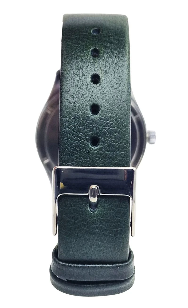Pasek zegarka wykonano ze skóry w kolorze zielonym, dzięki czemu stanowi ciekawy, ale nadal stonowany akcent kolorystyczny całego modelu. Jego szerokość wynosi 18 mm, co dobrze odpowiada proporcjom koperty i zapewnia wygodne ułożenie zegarka na nadgarstku. Całość uzupełnia klamerka ze stali nierdzewnej, a maksymalny obwód zestawu pasek + zegarek wynosi 20 cm.