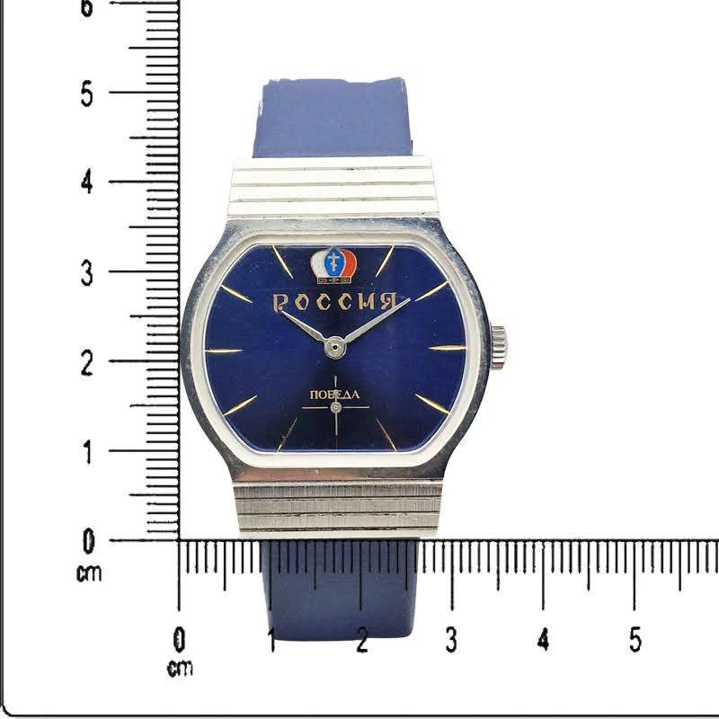Zegarek РОССИЯ Победа to wyjątkowy model z pierwszej połowy lat 90., powstały w okresie przemian po upadku ZSRR, kiedy klasyczne mechanizmy otrzymywały zupełnie nową oprawę wizualną. Prezentowany egzemplarz wyróżnia się głęboką, granatową tarczą z charakterystycznym napisem „Россия” oraz eleganckimi złoconymi indeksami, które nadają mu niepowtarzalny wygląd. To propozycja dla osób ceniących zegarki z historią, jednocześnie szukających czegoś mniej oczywistego niż typowe modele z epoki.