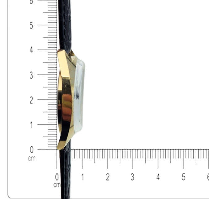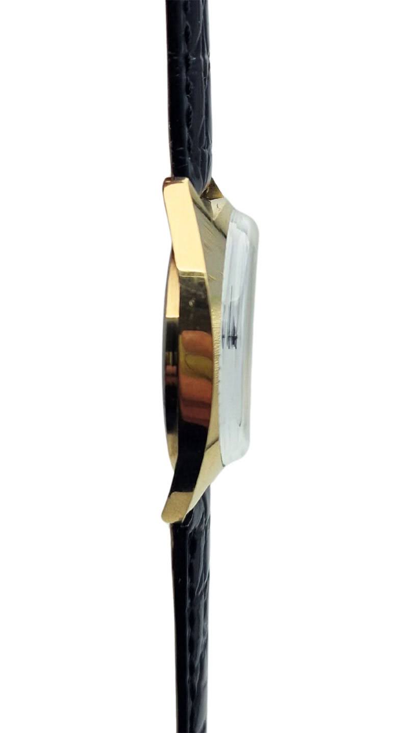 Koperta jest złocona i utrzymana w prostym, geometrycznym stylu charakterystycznym dla lat 70–80. Smukłe uszy i cienki profil sprawiają, że zegarek wygodnie układa się na nadgarstku i pozostaje dyskretny podczas noszenia. Zastosowano stalowy dekiel mocowany na zakręcany pierścień oraz klasyczną karbowaną koronkę ułatwiającą nakręcanie.