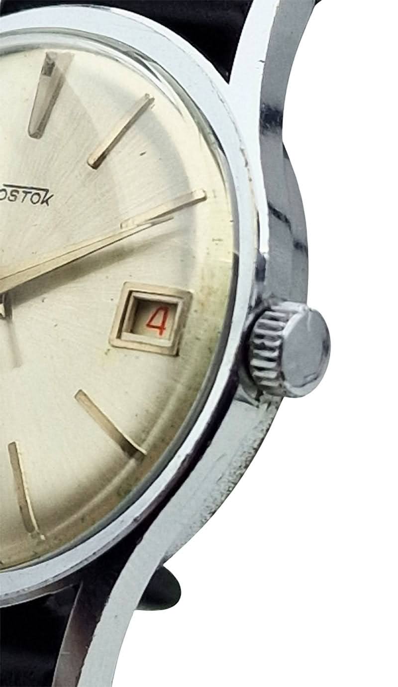 Tarcza ma srebrny kolor i eleganckie wykończenie typu sunburst, które pięknie odbija światło pod różnym kątem. Czas wskazują smukłe, nakładane indeksy w kolorze srebrnym, harmonizujące z klasycznymi wskazówkami. Na godzinie 3 umieszczono okienko datownika z czerwonymi cyframi, a całość uzupełniają napisy „Wostok”, „18 jewels” oraz „Made in USSR”.