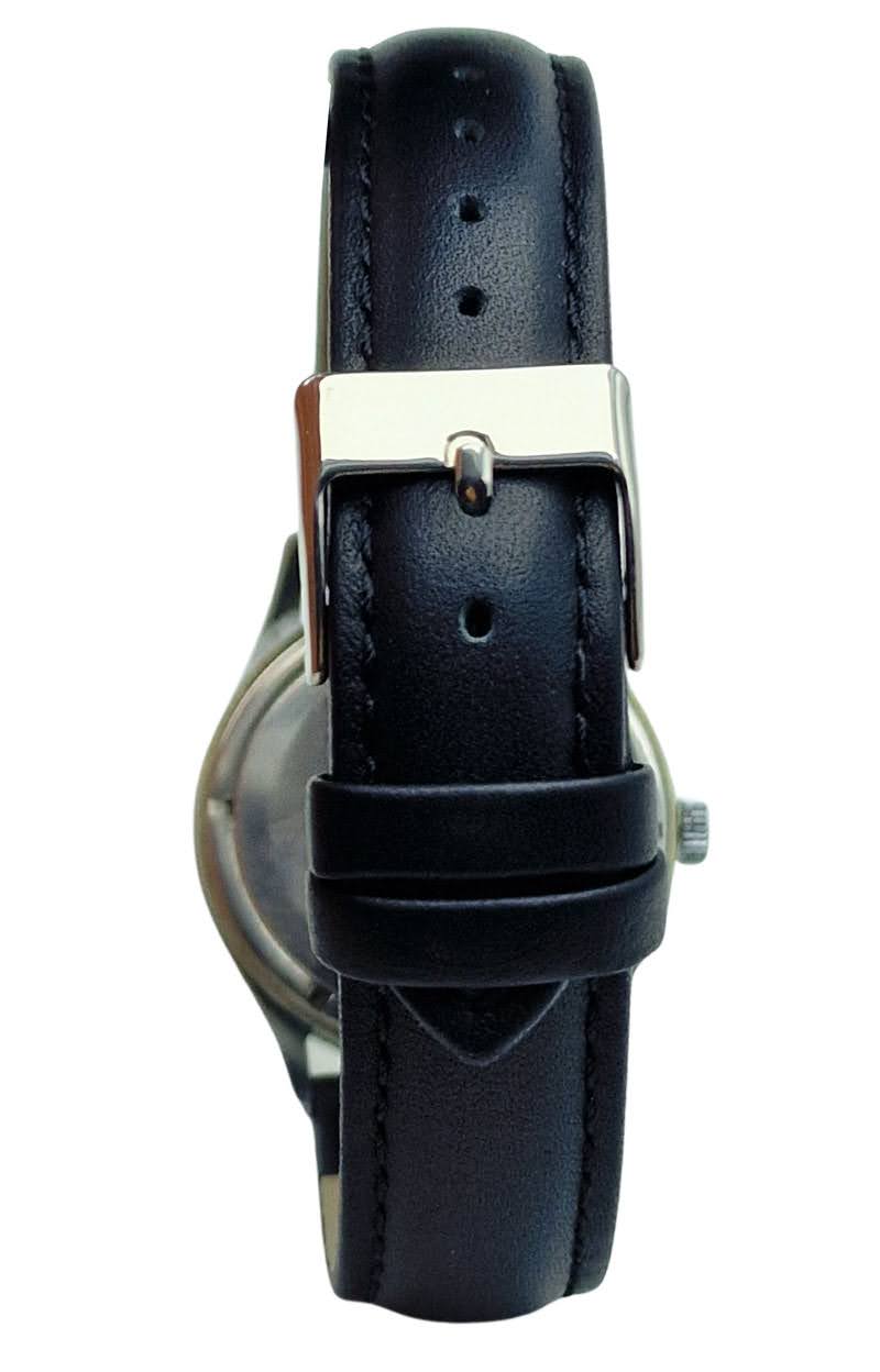 Pasek wykonany jest z czarnej skóry naturalnej o szerokości 18 mm, idealnie dopasowanej do klasycznych proporcji koperty. Całkowity obwód zegarka z paskiem wynosi 22 cm, co zapewnia wygodne dopasowanie do większości nadgarstków, a klasyczna sprzączka w kolorze srebrnym dopełnia elegancki wygląd całości.