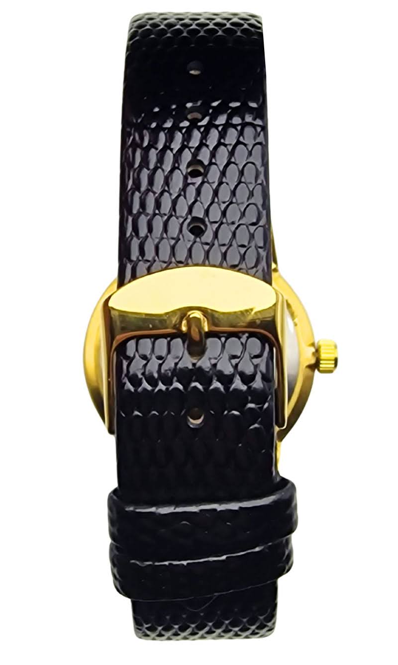 Pasek wykonano ze skóry naturalnej, która została lakierowana i tłoczona, tworząc elegancką strukturę przypominającą skórę gadzią. Jego czarny kolor dodaje zegarkowi klasy i podkreśla kontrast względem złoconej koperty. Całość uzupełnia klamerka ze stali nierdzewnej w kolorze złotym, która harmonijnie współgra z wykończeniem koperty i zapewnia trwałość podczas codziennego użytkowania.