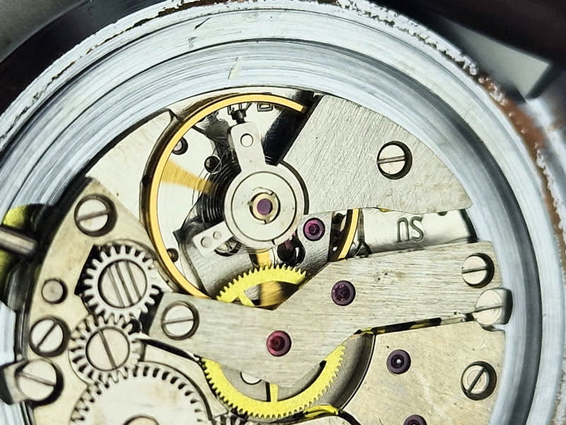 Mechanizm to Slava 2414 z ręcznym naciągiem i 21 kamieniami łożyskującymi, produkowany przez II Moskiewską Fabrykę Zegarków. Charakterystyczna konstrukcja z podwójnym bębnem sprężyny zapewnia stabilniejszą i równomierną pracę, a rezerwa chodu wynosi około 40 godzin. Po przeglądzie zegarmistrzowskim mechanizm jest przygotowany do dalszego użytkowania.