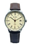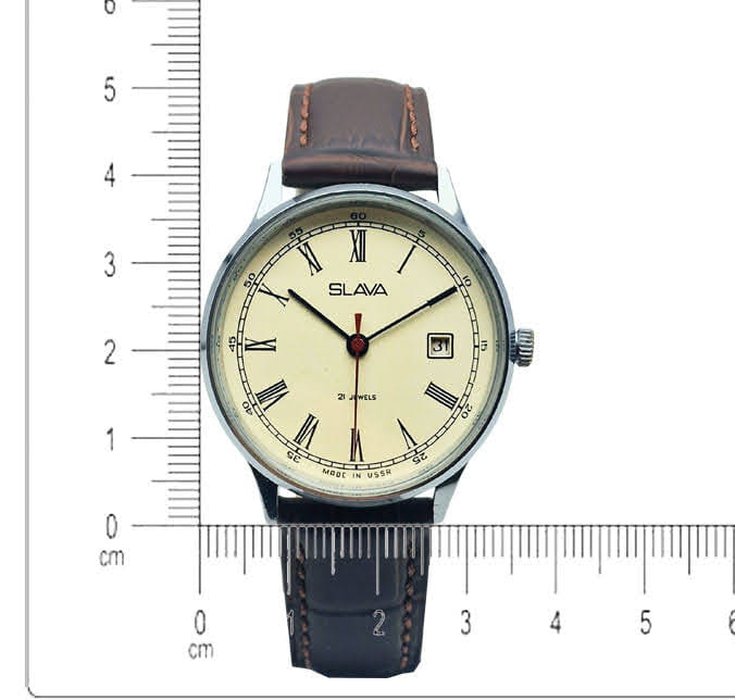 Tarcza ma kremowo-szampański kolor i klasyczny układ z czarnymi rzymskimi indeksami godzinowymi. Na godzinie 3 znajduje się okienko datownika, a pod logo umieszczono oznaczenie 21 jewels oraz Made in USSR. Całość dopełniają czarne wskazówki i czerwony sekundnik, zapewniające czytelny odczyt czasu.