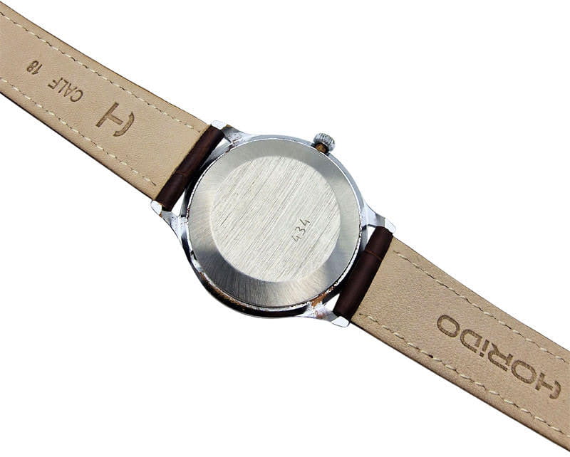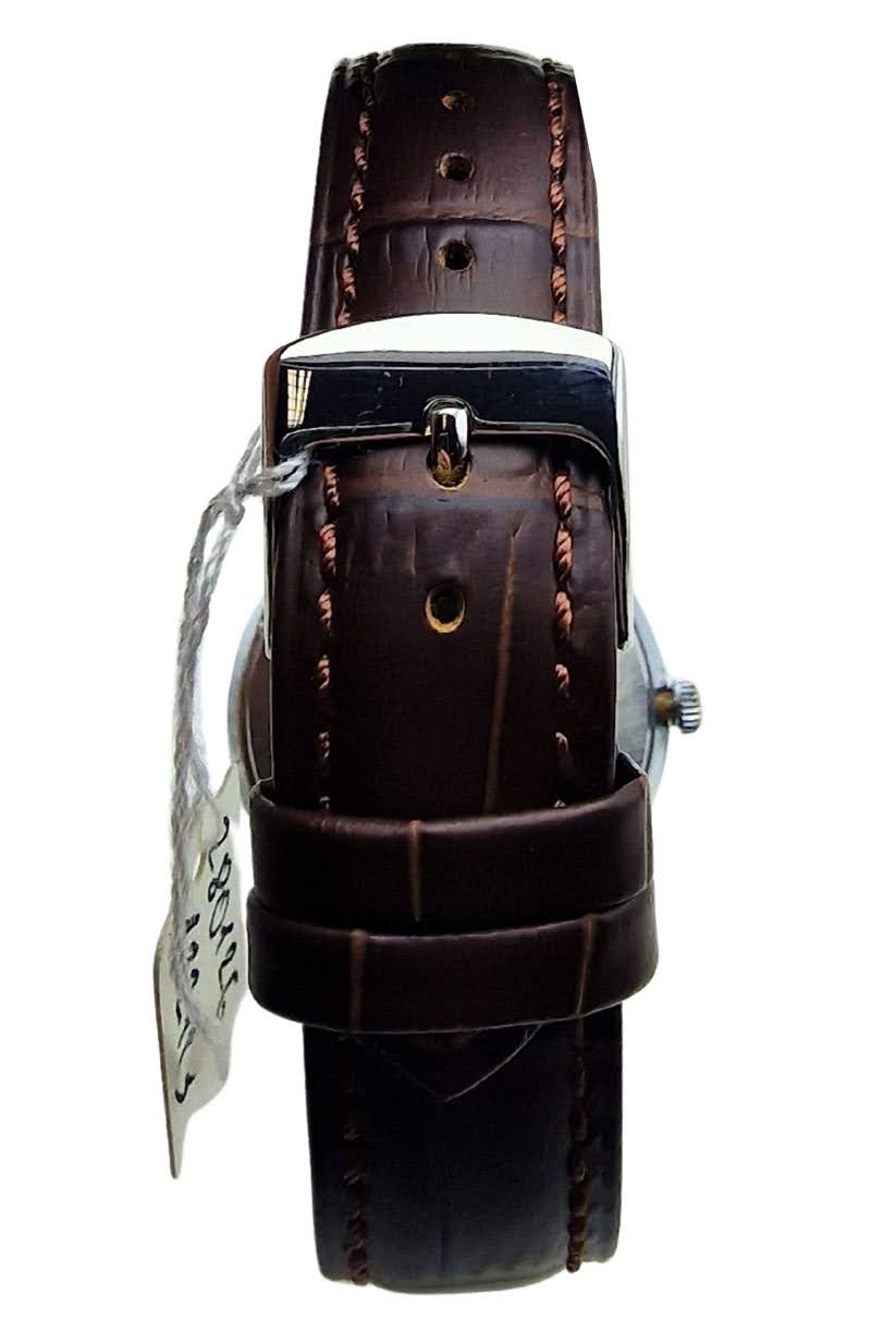 Zegarek zamocowano na pasku z naturalnej skóry w kolorze brązowym z tłoczeniem, który podkreśla klasyczny charakter modelu. Pasek ma szerokość 18 mm oraz maksymalny obwód 21 cm, dzięki czemu wygodnie układa się na nadgarstku. Całość zapinana jest na klamerkę ze stali nierdzewnej, odporną na codzienne użytkowanie.