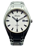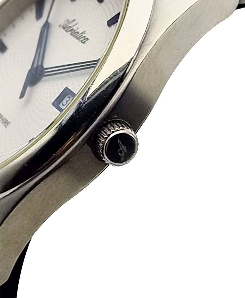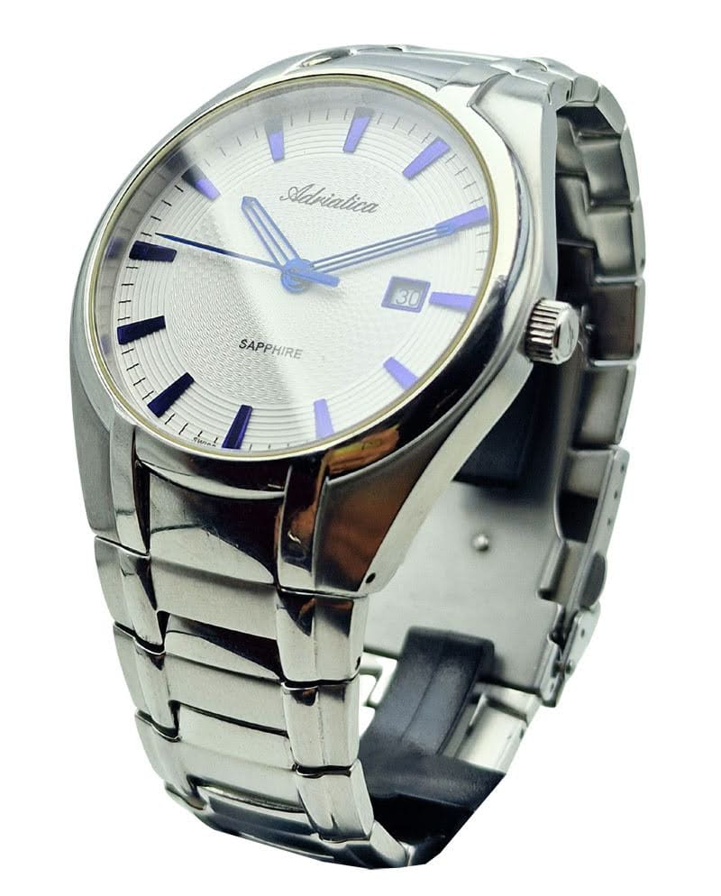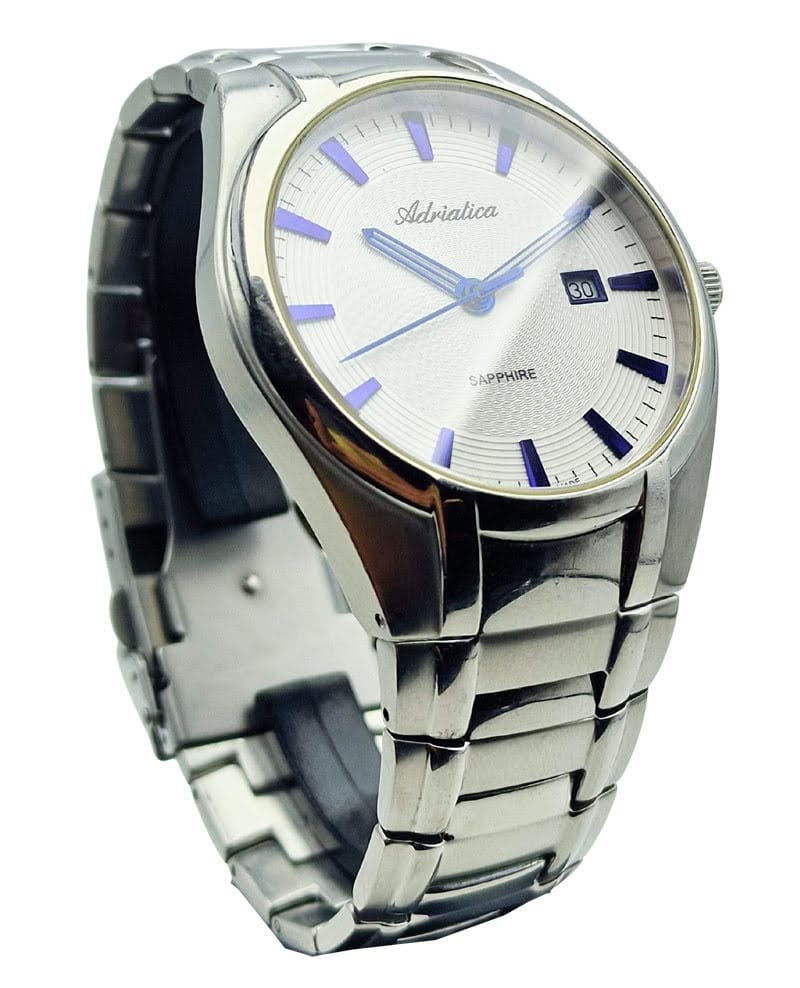 Tarcza zegarka utrzymana jest w srebrzysto-białej tonacji z wyraźnym giloszowaniem, które dodaje jej głębi i elegancji. Nakładane granatowe indeksy oraz dopasowane wskazówki tworzą harmonijną i czytelną kompozycję. Funkcjonalność podkreśla datownik na godzinie 3, a całość dopełniają logo „Adriatica” i oznaczenie „Swiss Made”, potwierdzające szwajcarskie pochodzenie.
