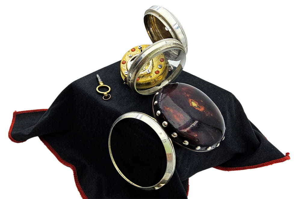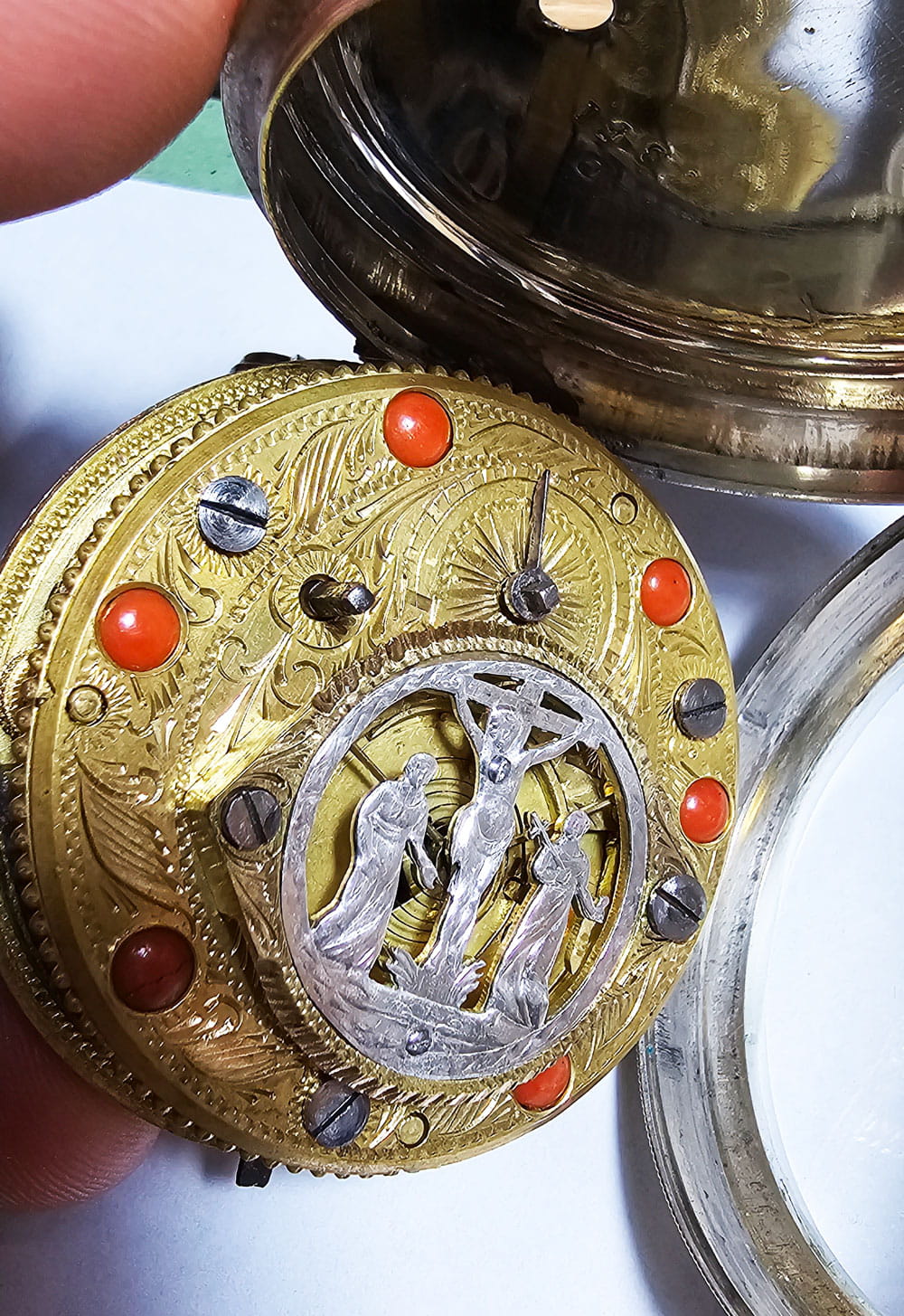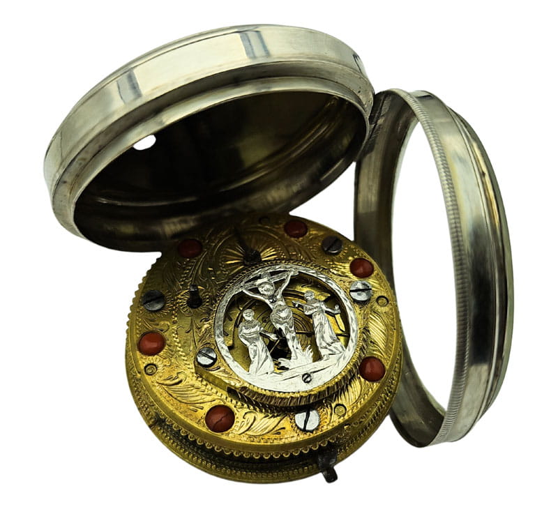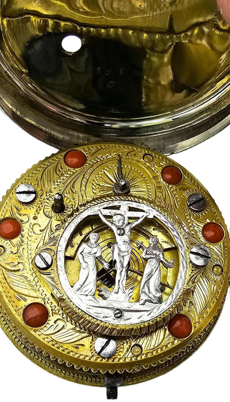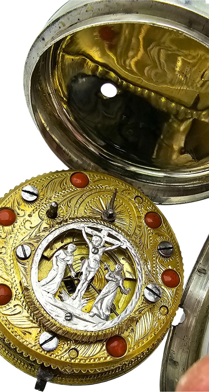 KOLEKCJONERSKI UNIKATOWY SREBRNY używany - Kieszonkowy, Watykański "Szpindlak". Najprawdopodobniej eksponat pochodzi z czasów Ludwika XV czyli z połowy XVIII wieku.Zegarek srebrny szpindlak. Koperta zewnętrzna tzw "Boîte" wykonana ręcznie z Szylkretu - czyli materiału wykonywanego z rogowych płytek pokrywających pancerz żółwi. Jest to 100% rękodzieło wykonane we Francji. Koperta podwójna wykonana ze srebra. Część zewnętrzna ręcznie, bogato zdobiona szylkretem wraz ze srebrnymi inkrustacjami.Część wewnętrzna gładka, wykonana w całości ze srebra.Zegarek ten posiada lekko uszkodzoną tarczę widoczną na zdjęciu. Cały zegarek zachowany w 100% w oryginale, nigdy nie był poddawany renowacji.Tarcza wykonana z emalii w kolorze białym z czarnymi cyframi rzymskimi oraz z arabską indeksacją minut, w 100% zachowana w oryginale. Wskazówki w 100% zachowane w oryginale. Nakręcanie mechanizmu oraz nastawianie godziny odbywa się za pomocą specjalnego kluczyka, który jest dołączony do zegarka. Mechanizm zegarka ręcznie wykonany typu szpindlak (kolibnik). Misternie zdobiony w 100% ręcznie, skomplikowanym giloszem, naokoło inkrustowany oryginalnym koralem. Obudowa koła balansowego - tzw "kok" przedstawia ręcznie wykonaną i rzeźbioną scenkę rodzajową ukazującą Jezusa na krzyżu wraz z Matką Boską Maryją oraz żołnierza Longina (Lucjana) trzymającego Włócznię Przeznaczenia, którą to włócznią Longin przebił bok Jezusa przed zdjęciem go z krzyża. Scena ta miała miejsce na górze Golgota około 33 roku naszej ery. Dodatkowo mechanizm posiada regulację włosa za pomocą jednego kluczyka, tego samego, którym nakręcamy sprężynę oraz nastawiamy godzinę na tarczy.