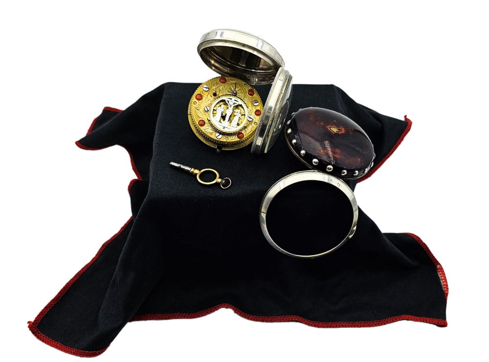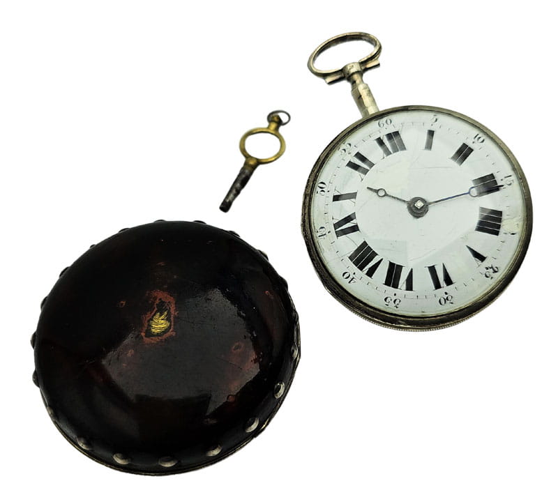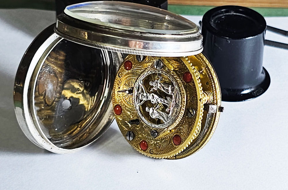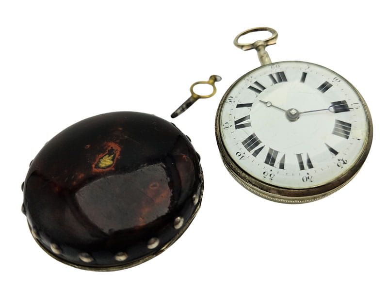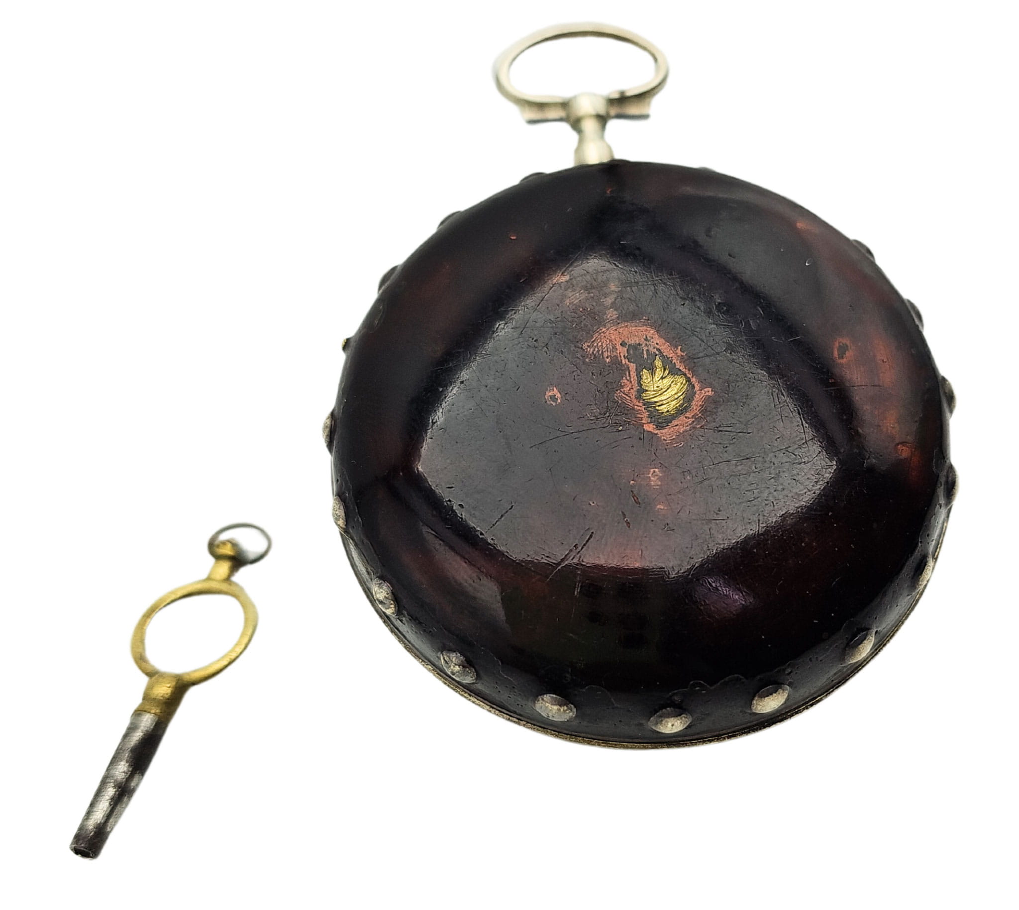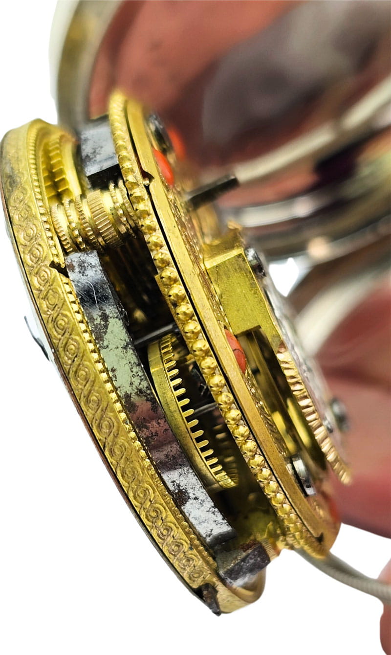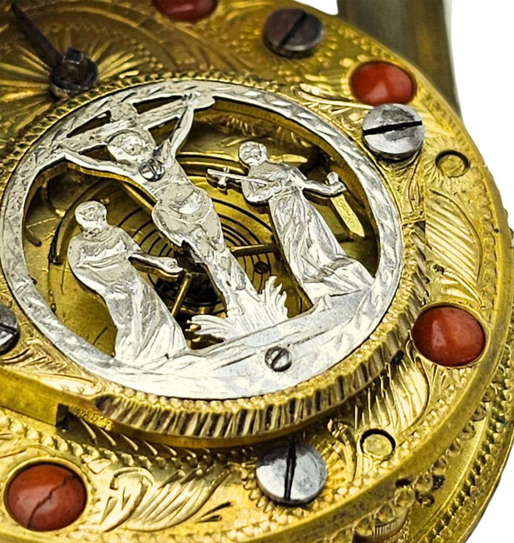 KOLEKCJONERSKI UNIKATOWY SREBRNY używany - Kieszonkowy, Watykański "Szpindlak". Najprawdopodobniej eksponat pochodzi z czasów Ludwika XV czyli z połowy XVIII wieku.Zegarek srebrny szpindlak. Koperta zewnętrzna tzw "Boîte" wykonana ręcznie z Szylkretu - czyli materiału wykonywanego z rogowych płytek pokrywających pancerz żółwi. Jest to 100% rękodzieło wykonane we Francji. Koperta podwójna wykonana ze srebra. Część zewnętrzna ręcznie, bogato zdobiona szylkretem wraz ze srebrnymi inkrustacjami.Część wewnętrzna gładka, wykonana w całości ze srebra.Zegarek ten posiada lekko uszkodzoną tarczę widoczną na zdjęciu. Cały zegarek zachowany w 100% w oryginale, nigdy nie był poddawany renowacji.Tarcza wykonana z emalii w kolorze białym z czarnymi cyframi rzymskimi oraz z arabską indeksacją minut, w 100% zachowana w oryginale. Wskazówki w 100% zachowane w oryginale. Nakręcanie mechanizmu oraz nastawianie godziny odbywa się za pomocą specjalnego kluczyka, który jest dołączony do zegarka. Mechanizm zegarka ręcznie wykonany typu szpindlak (kolibnik). Misternie zdobiony w 100% ręcznie, skomplikowanym giloszem, naokoło inkrustowany oryginalnym koralem. Obudowa koła balansowego - tzw "kok" przedstawia ręcznie wykonaną i rzeźbioną scenkę rodzajową ukazującą Jezusa na krzyżu wraz z Matką Boską Maryją oraz żołnierza Longina (Lucjana) trzymającego Włócznię Przeznaczenia, którą to włócznią Longin przebił bok Jezusa przed zdjęciem go z krzyża. Scena ta miała miejsce na górze Golgota około 33 roku naszej ery. Dodatkowo mechanizm posiada regulację włosa za pomocą jednego kluczyka, tego samego, którym nakręcamy sprężynę oraz nastawiamy godzinę na tarczy.