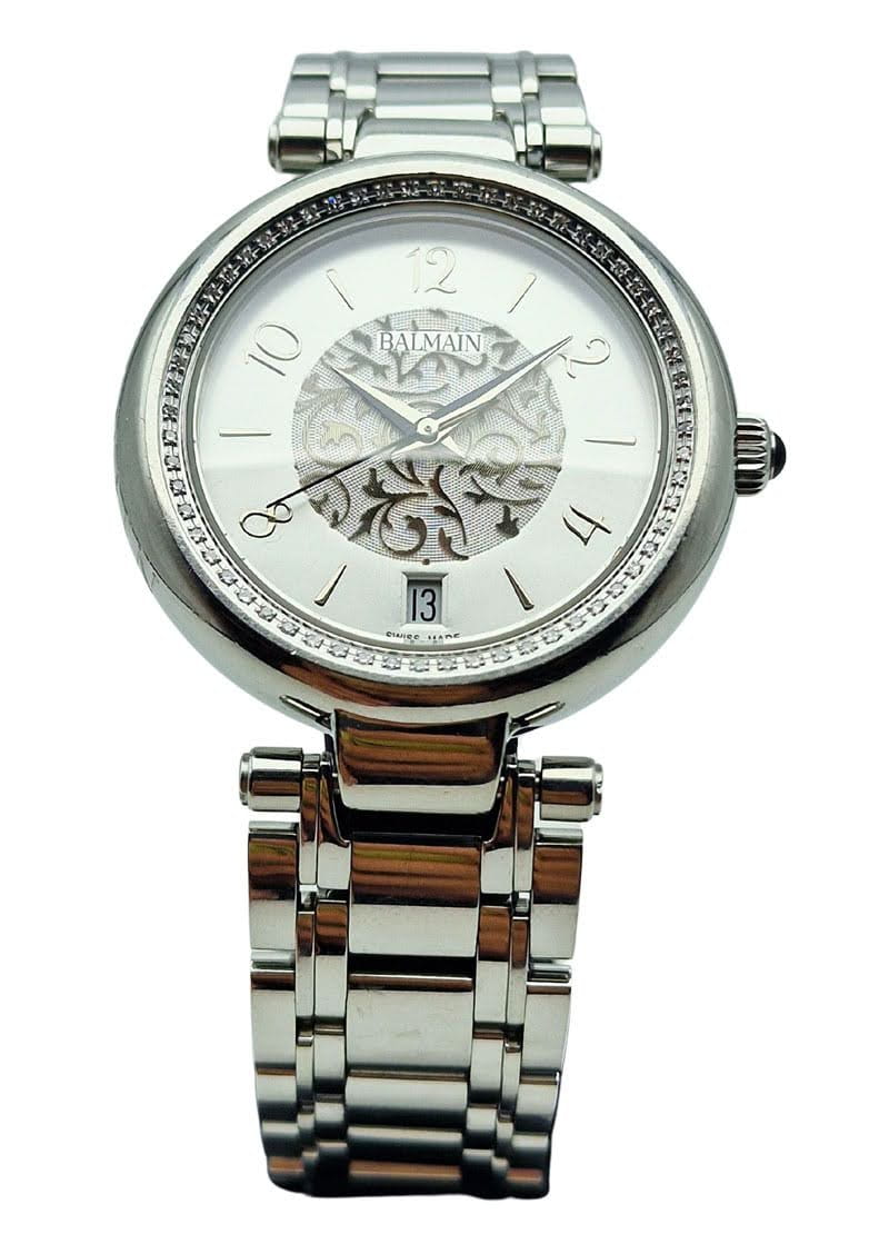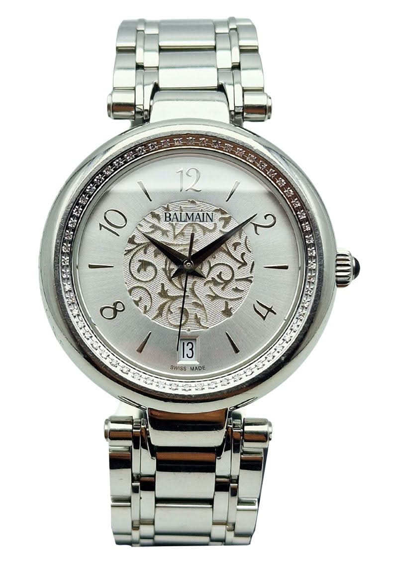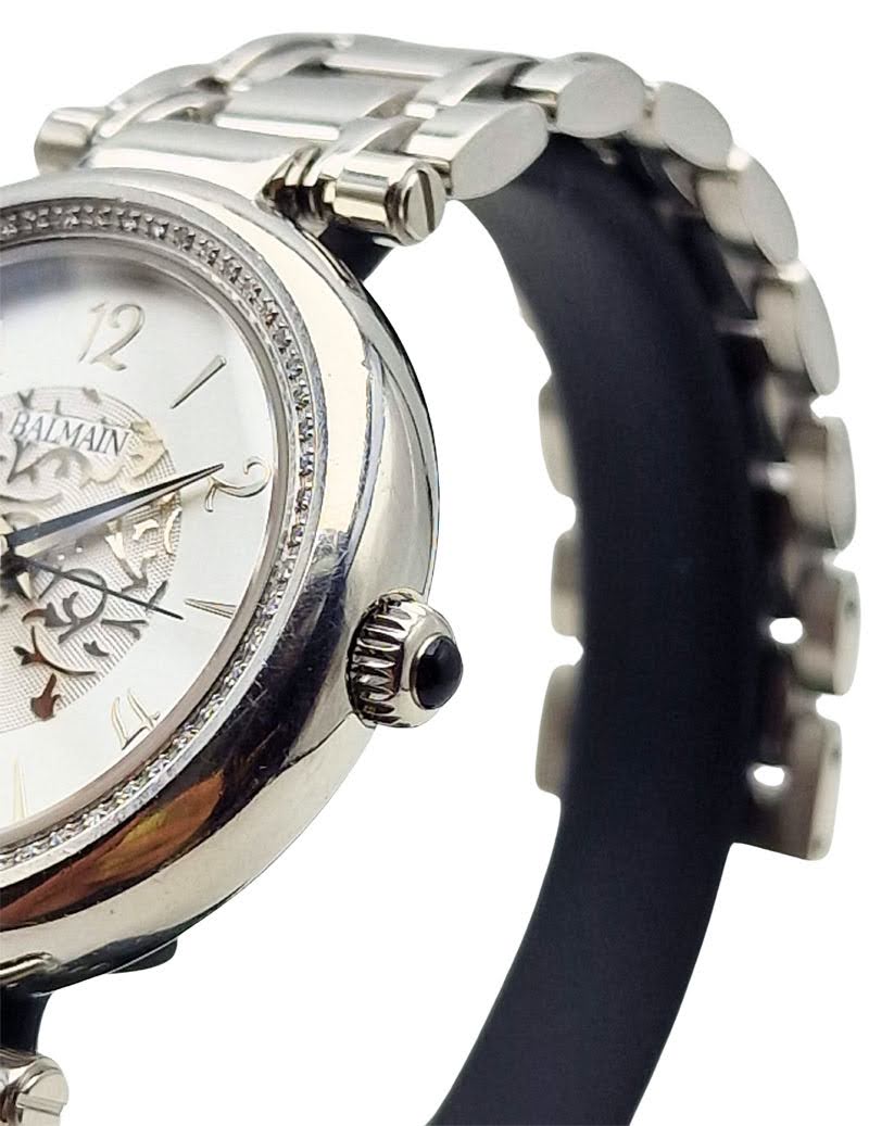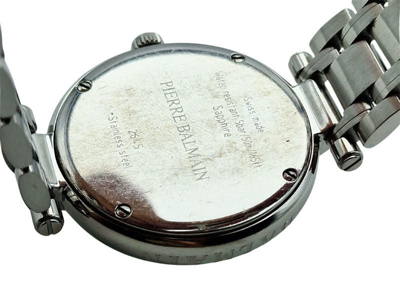 - Dekiel: pełny, stalowy, sygnowany logo Pierre Balmain, zapewniający dodatkową ochronę mechanizmu.