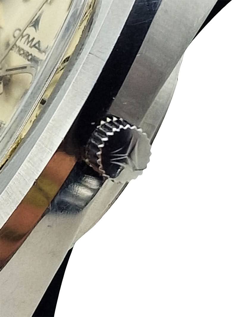 Tarcza ma srebrny kolor, który elegancko odbija światło i nadaje zegarkowi klasyczny charakter typowy dla modeli Cyma z epoki. Srebrne indeksy z czarnym wypełnieniem tworzą wyrazisty kontrast, dzięki czemu odczyt czasu jest czytelny w każdych warunkach. Datownik na godzinie 6 harmonijnie uzupełnia kompozycję, zachowując symetrię i podkreślając minimalistyczny styl tarczy.