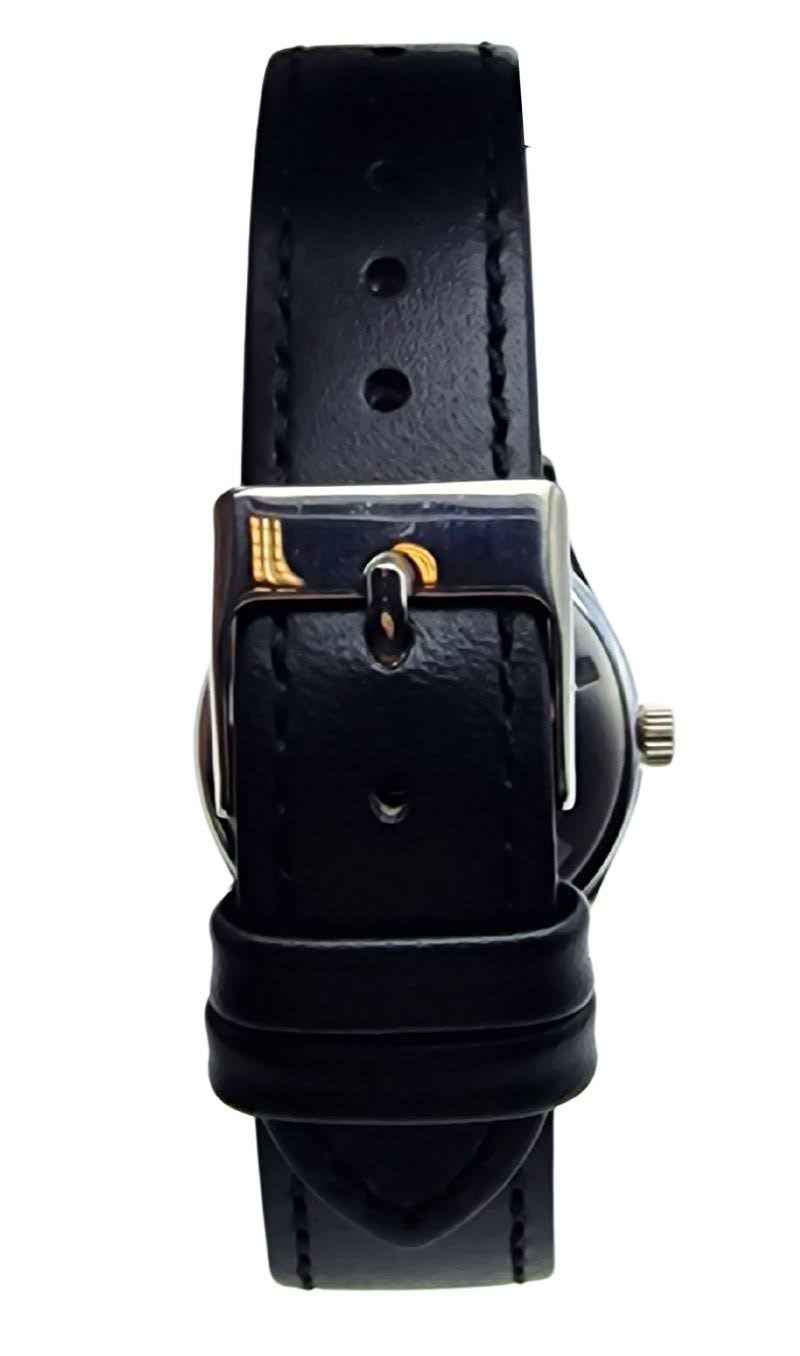 Do zegarka dobrano nowy pasek z czarnej skóry naturalnej o szerokości 18 mm. Skóra jest miękka i od razu dopasowuje się do ręki, a jej faktura koresponduje z elegancką tarczą. Całość wieńczy stalowa klamerka, zapewniająca bezpieczne i komfortowe noszenie.