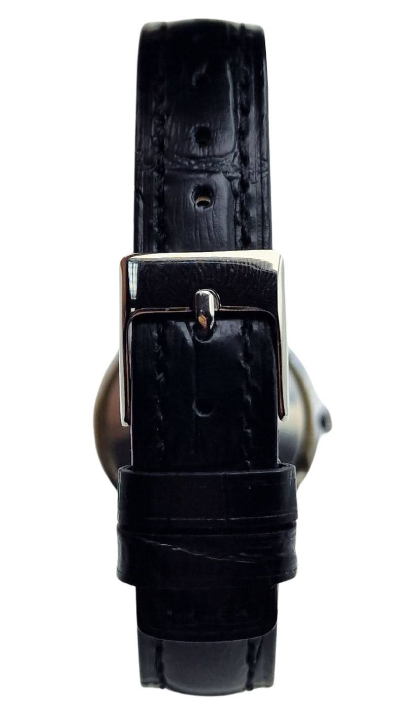 Pasek wykonany jest z naturalnej skóry w kolorze czarnym, dopasowanej fakturą do eleganckiego charakteru zegarka. Ma 16 mm szerokości oraz klasyczną konstrukcję, co zapewnia wygodę podczas noszenia. Całość zamyka stalowa klamerka, która wizualnie komponuje się z chromowaną kopertą zegarka.