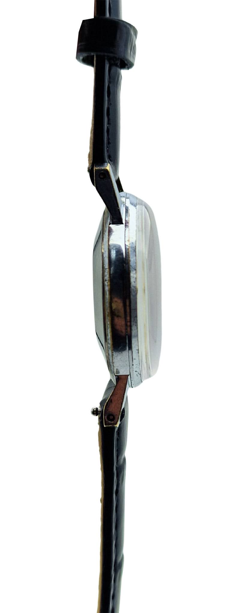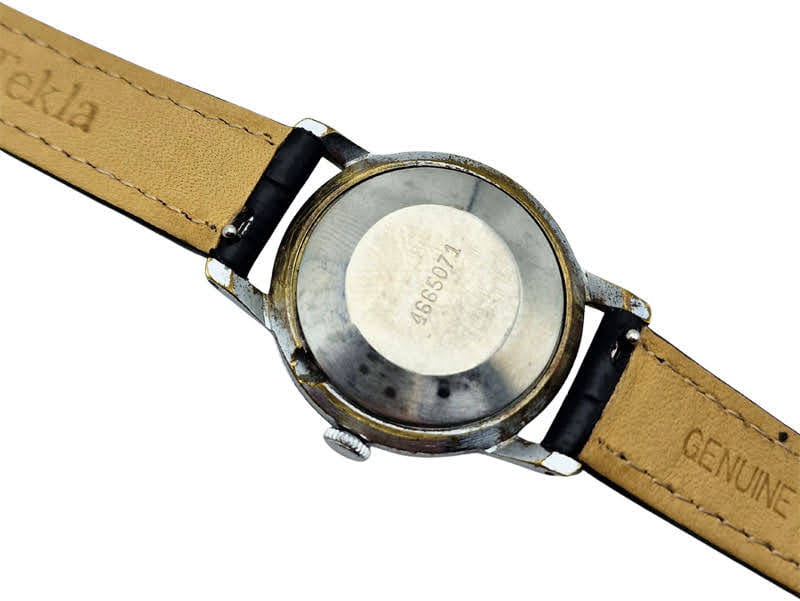 Koperta zachowuje smukłą, klasyczną formę typową dla średniej wielkości zegarków z tamtych lat. Wykonana w chromowanym wykończeniu z deklem ze stali nierdzewnej, nosi drobne ślady użytkowania potwierdzające wiek. Całość uzupełnia oryginalna koronka, co jest kluczowe dla zachowania wartości kolekcjonerskiej przedmiotu.