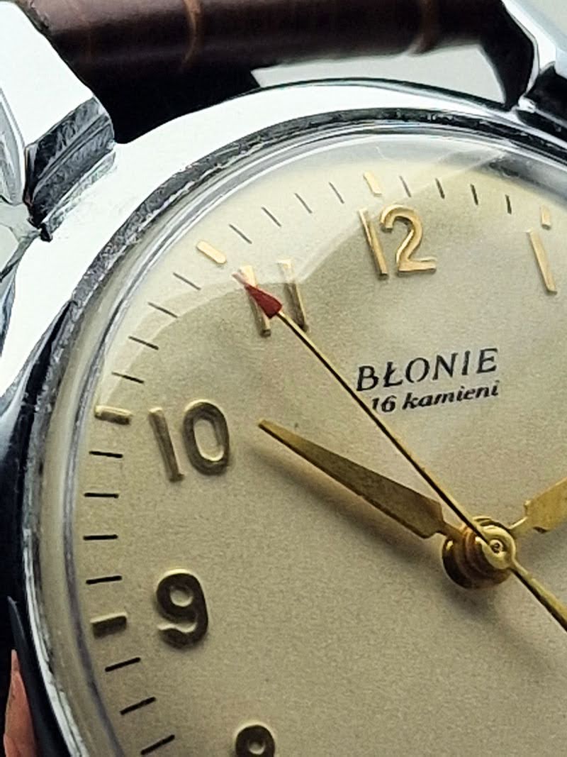 Zegarek Błonie 16 Kamieni to wyjątkowy przykład polskiego zegarmistrzostwa, stworzonego na licencji ZSRR w czasach, gdy w podwarszawskich zakładach powstawały pierwsze krajowe czasomierze. Jego srebrna tarcza ze złoconymi indeksami, smukła chromowana koperta i czerwony grot sekundnika tworzą połączenie elegancji i prostoty typowej dla epoki powojennego modernizmu. Napędzany ręcznym mechanizmem МЧЗ 2409, zegarek zachwyca nie tylko precyzją działania, ale też autentycznym charakterem, dzięki któremu każdy kolekcjoner dostrzeże w nim cząstkę historii polskiego designu.