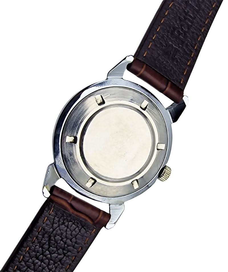 Koperta została wykonana z mosiądzu pokrytego chromem, dzięki czemu zachowała elegancki połysk i odporność na ślady czasu. Dekiel stalowy, zakręcany, solidnie zabezpiecza mechanizm i zapewnia dobrą szczelność konstrukcji. Całość dopełniają smukłe, wyprofilowane uszy oraz stalowa, karbowana koronka, które nadają zegarkowi klasyczny i zrównoważony wygląd typowy dla modeli Błonie z końca lat 50.