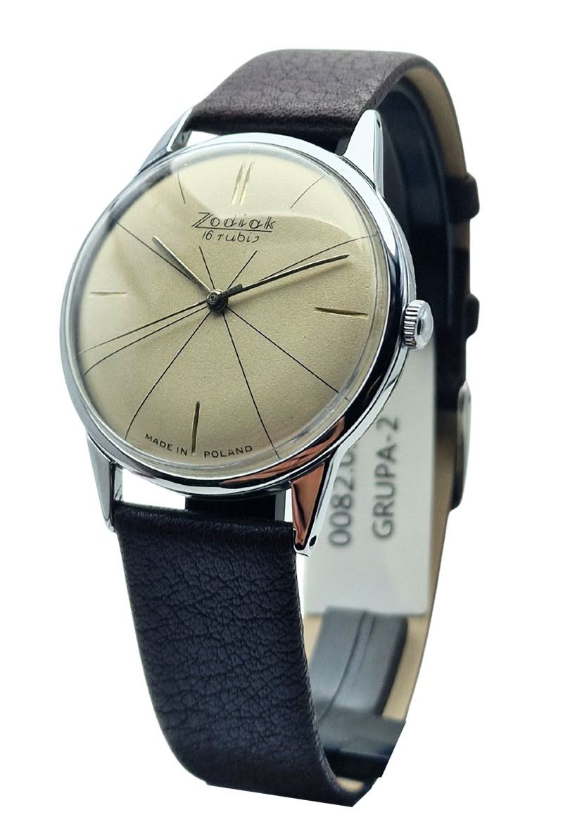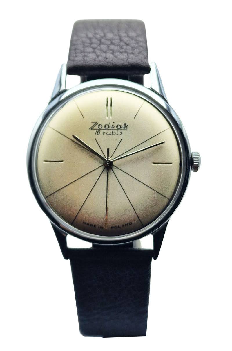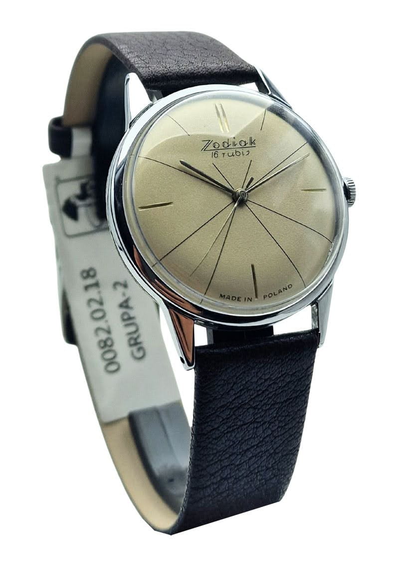 Prezentowany Zodiak 16 rubis to wyjątkowy przykład polskiego zegarmistrzostwa z lat 60., zachowany w znakomitym stanie po pełnej renowacji w naszej pracowni. Model ten łączy w sobie prostotę formy, elegancką srebrną tarczę z promienistym szlifem i złocone detale, tworząc ponadczasową kompozycję o wyjątkowym uroku. To zegarek, który nie tylko zachwyca wyglądem, ale także stanowi autentyczne świadectwo historii rodzimej precyzji i stylu.